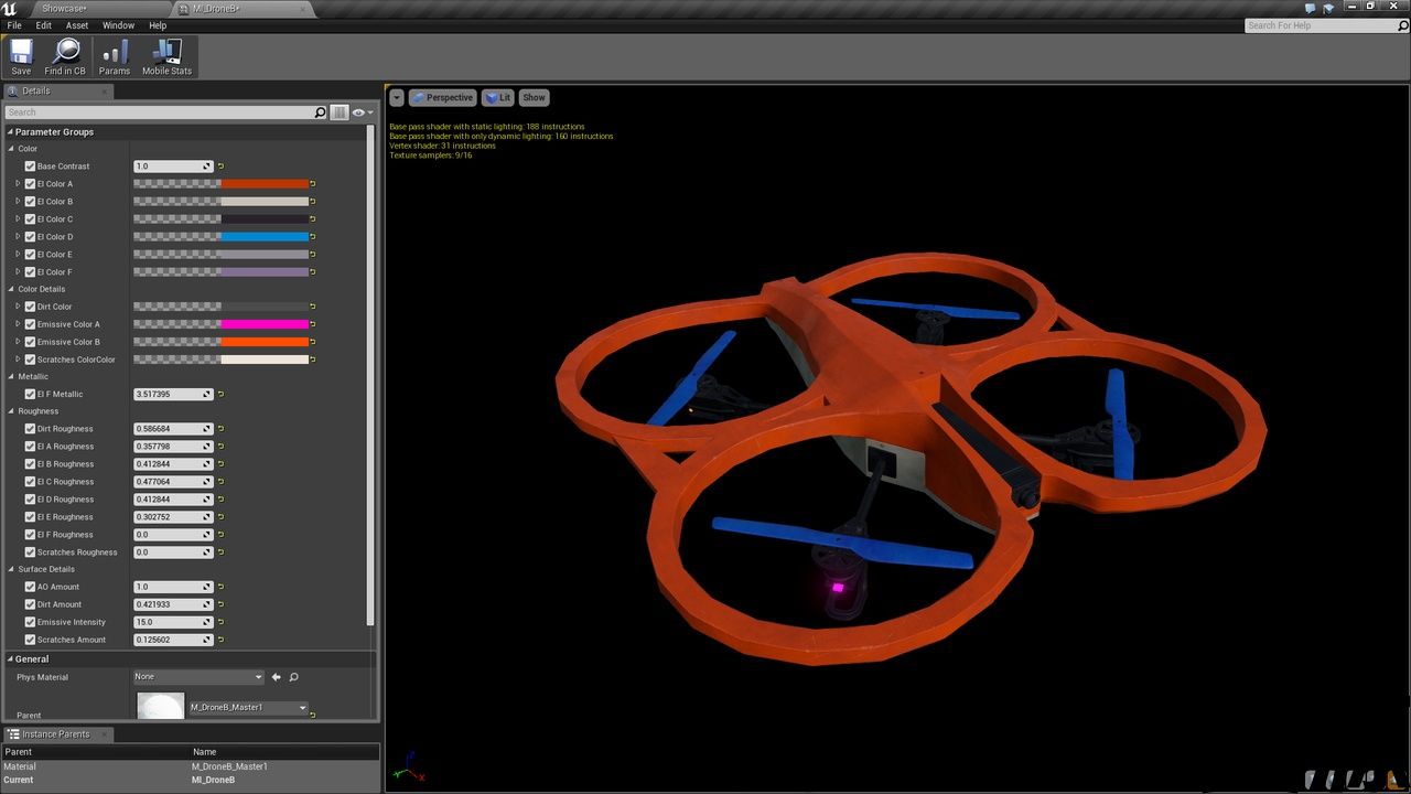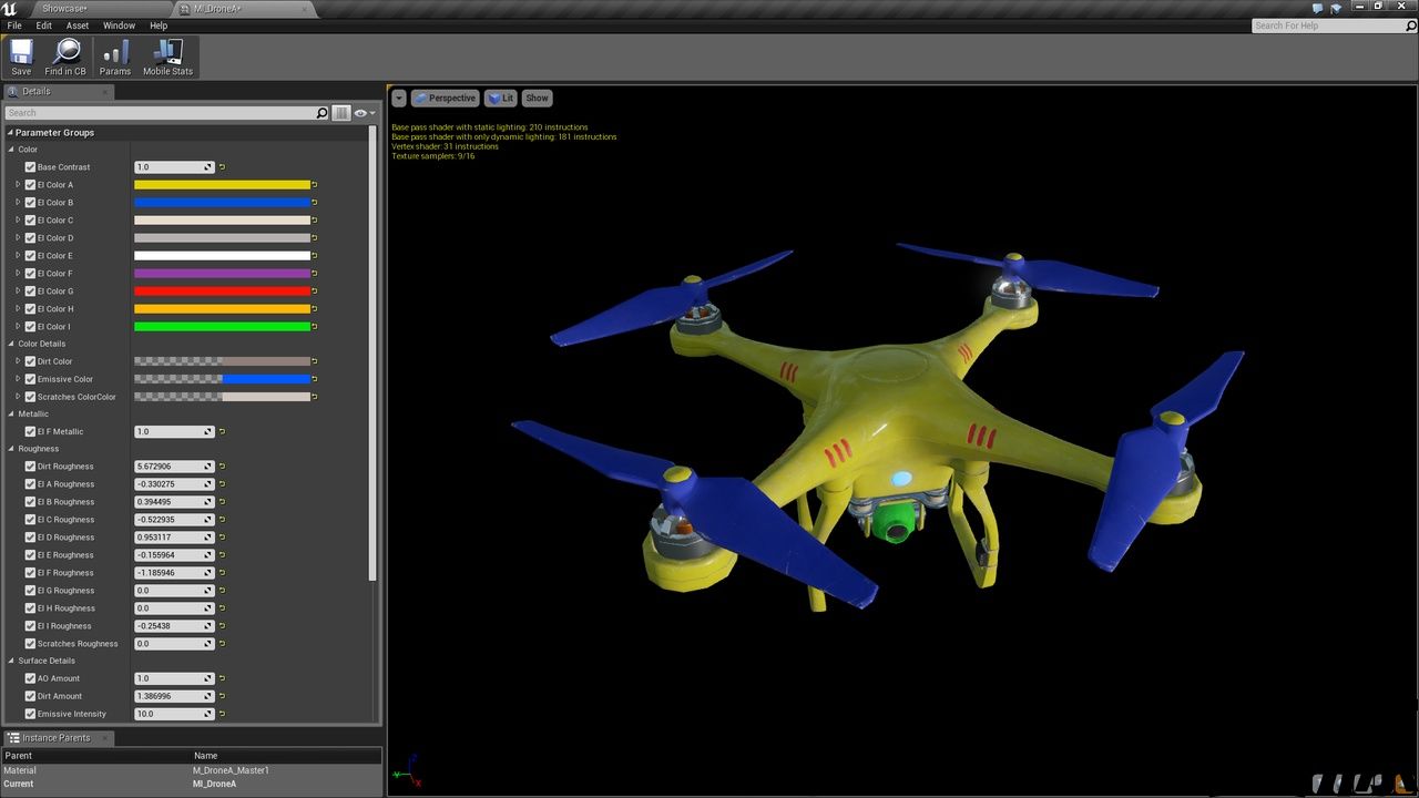 Realistic Quadcopters based on flying pawn with led and first person camera.. Complex Master materials have Parameters for Instances to create huge amount of colour variation. There is no skeleton, in this way drone’s mesh parts swapping is available.