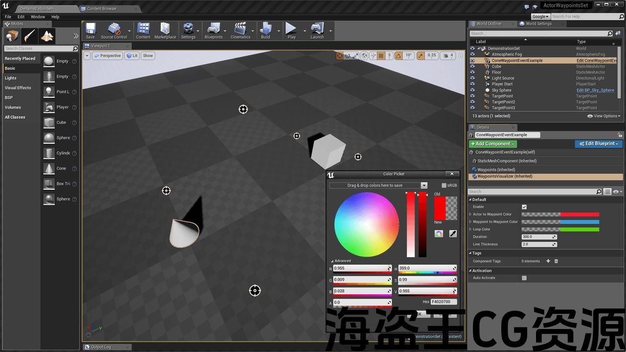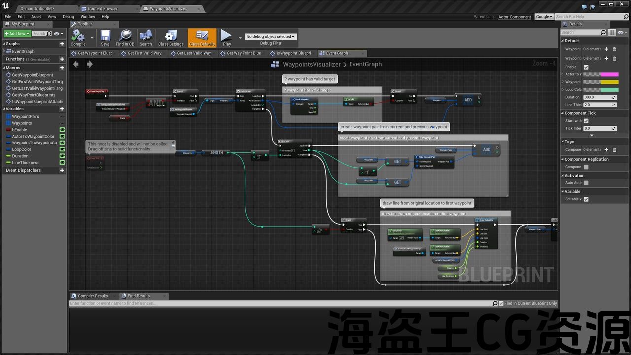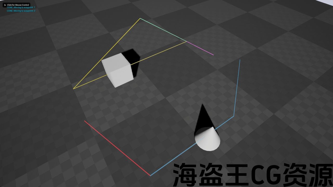 要查看行程线,请将waypoint visualizer组件捕捉到actor上,并自定义线的颜色、持续时间和粗细。 Waypoint可视化工具为每个actor移动的不同阶段(移动到第一个waypoint,waypoint到waypoint和loop)提供可编辑的线条颜色,并在播放期间在关卡中绘制它们。