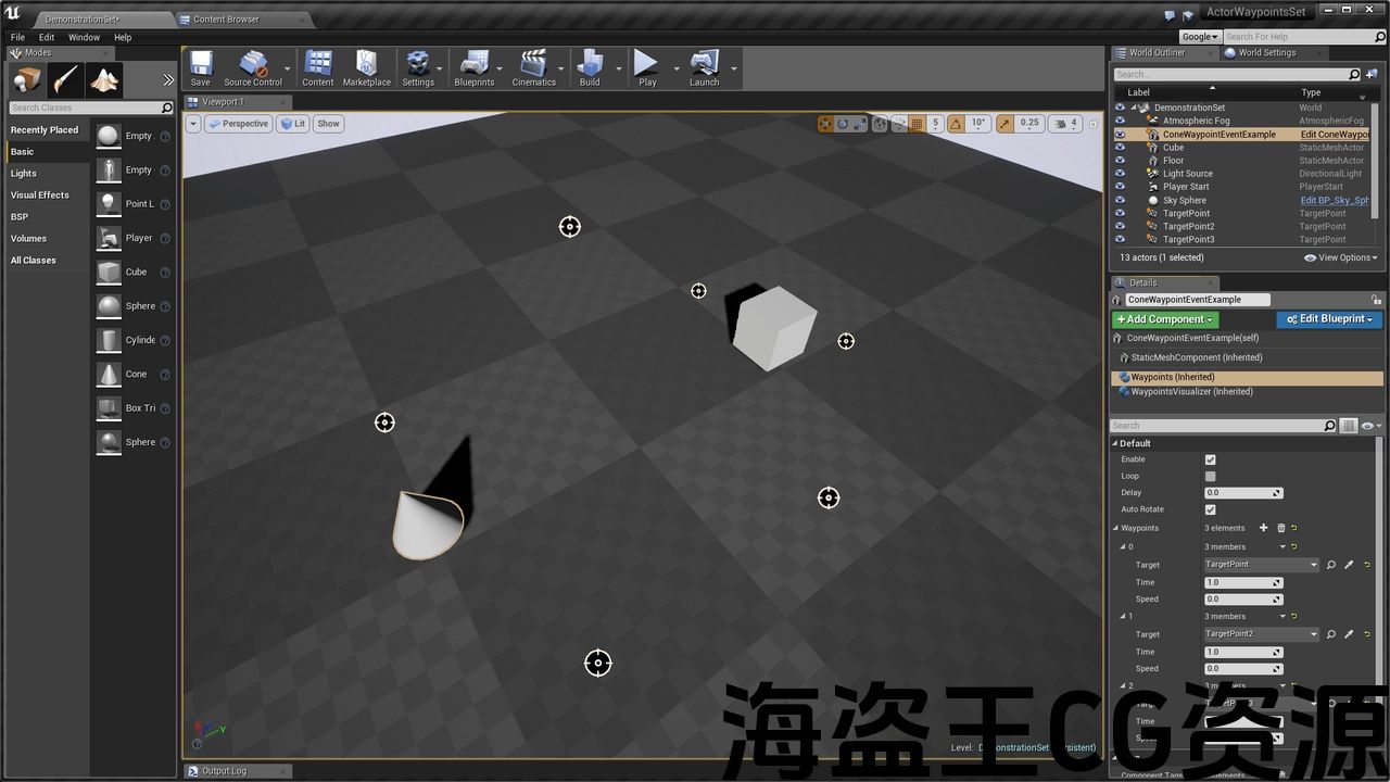 将目标点拖放到场景中,将航点组件捕捉到每个可移动actor上,并通过按名称选择目标点或直接在关卡中选择它们来添加航点。 接受默认值或设置每个actor从航点到航点的时间或速度。 启用循环可使actor在航点周围无限期地继续。
