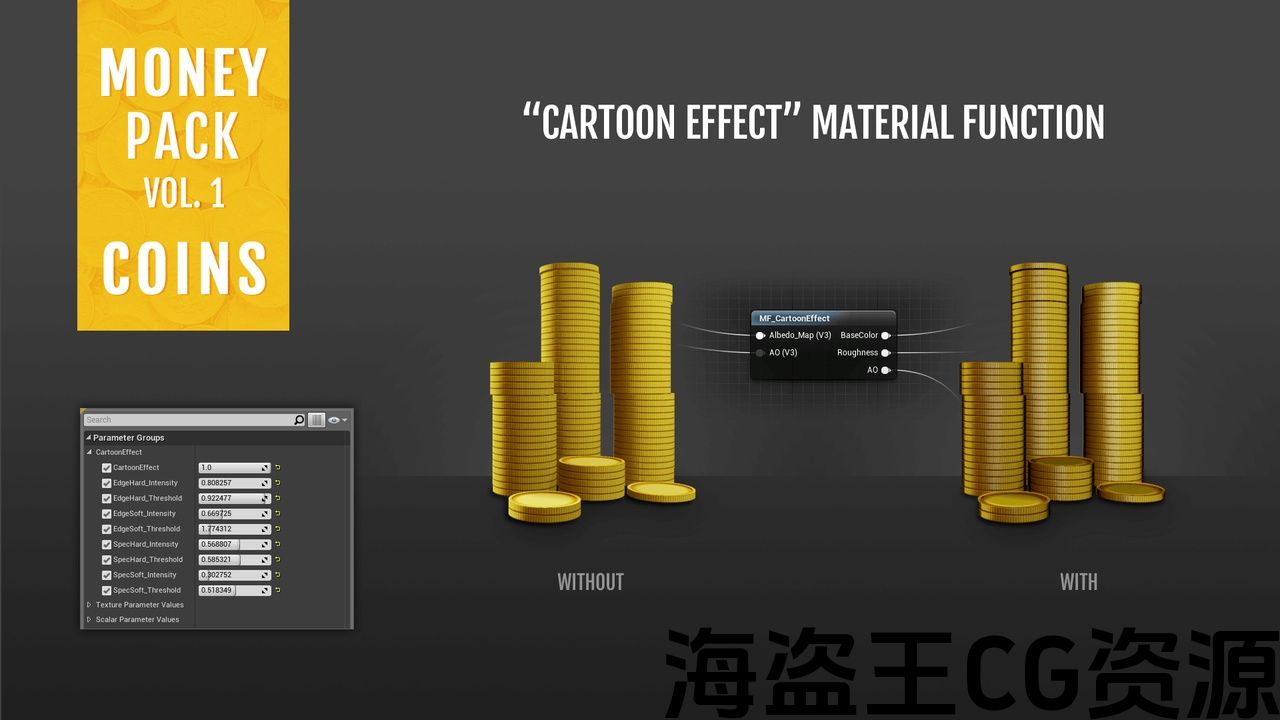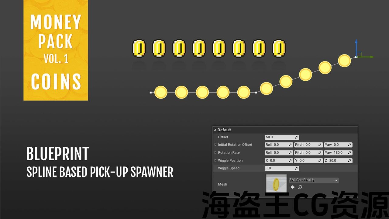 一个包包含24个静态网格体和8个骨架网格体,可随时添加到项目中。 捆绑了基于样条的拾取蓝图(非常适合在平台游戏中原型硬币拾取线)和”卡通效果”材质功能(以获得更程式化的资产外观)。