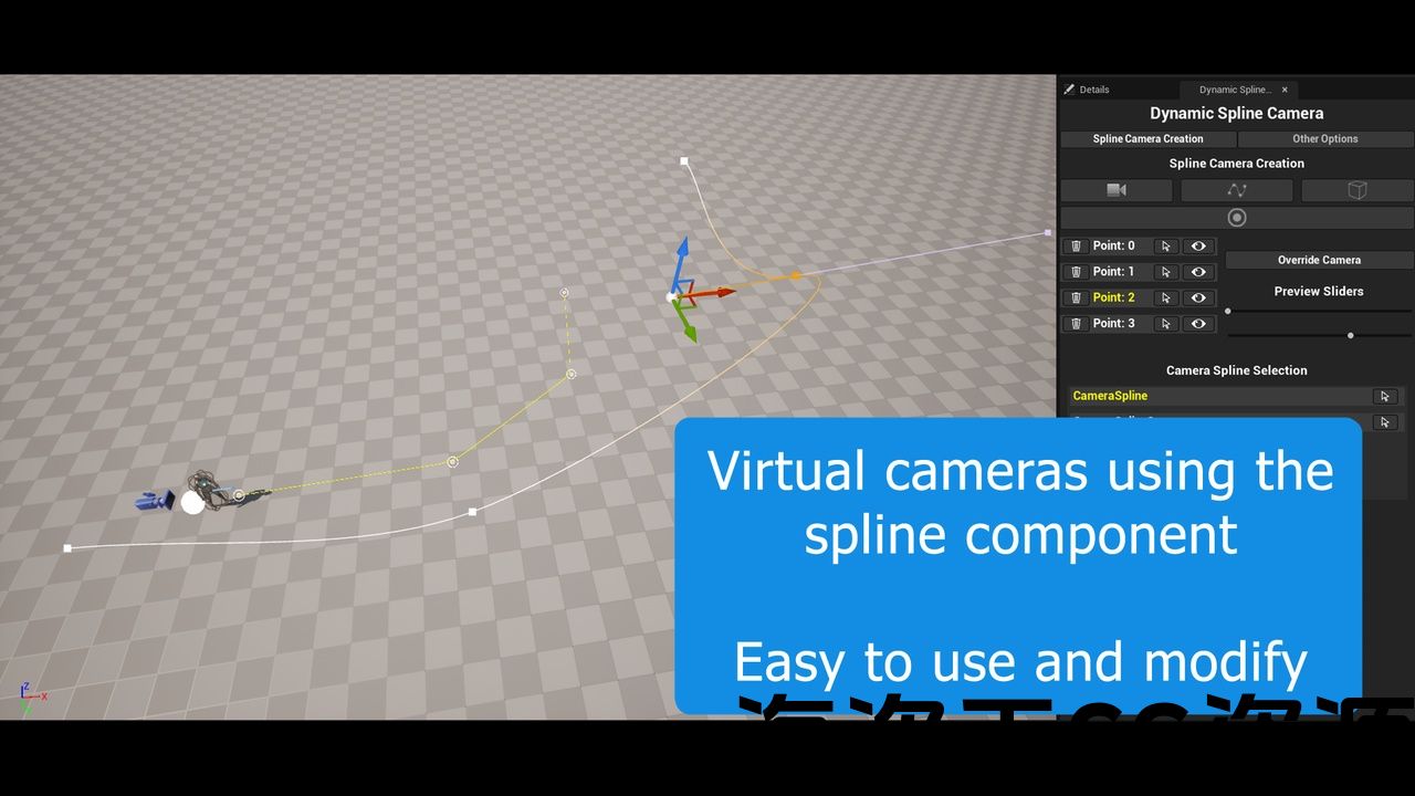 改善您的工作流程! 使用动态样条相机,您可以使用编辑器自己的相机将虚拟相机放置在样条之后!