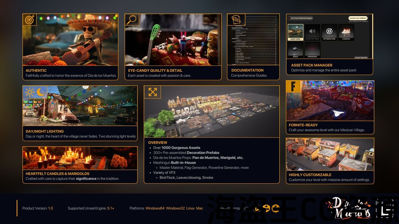 介绍情况 墨西哥-死亡日(Día De Muertos)-向传统致以衷心的敬意,为您的项目带来温暖、色彩和精神。 从发光的烛光祭坛到充满活力的乡村街道,每一个细节都精心制作,以捕捉这一庆祝活动的精髓。 凭借令人惊叹的日/夜照明,手工制作的装饰和大量的定制方式,这个包让你建立一个真正感觉活着的世界。