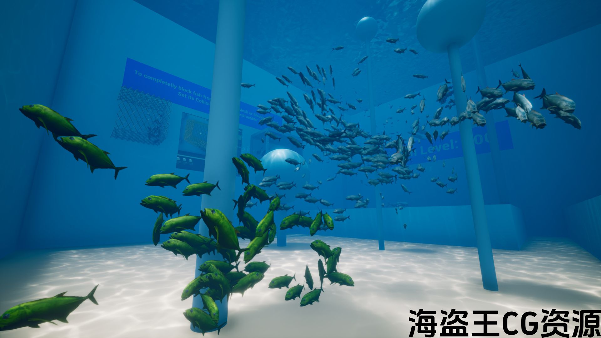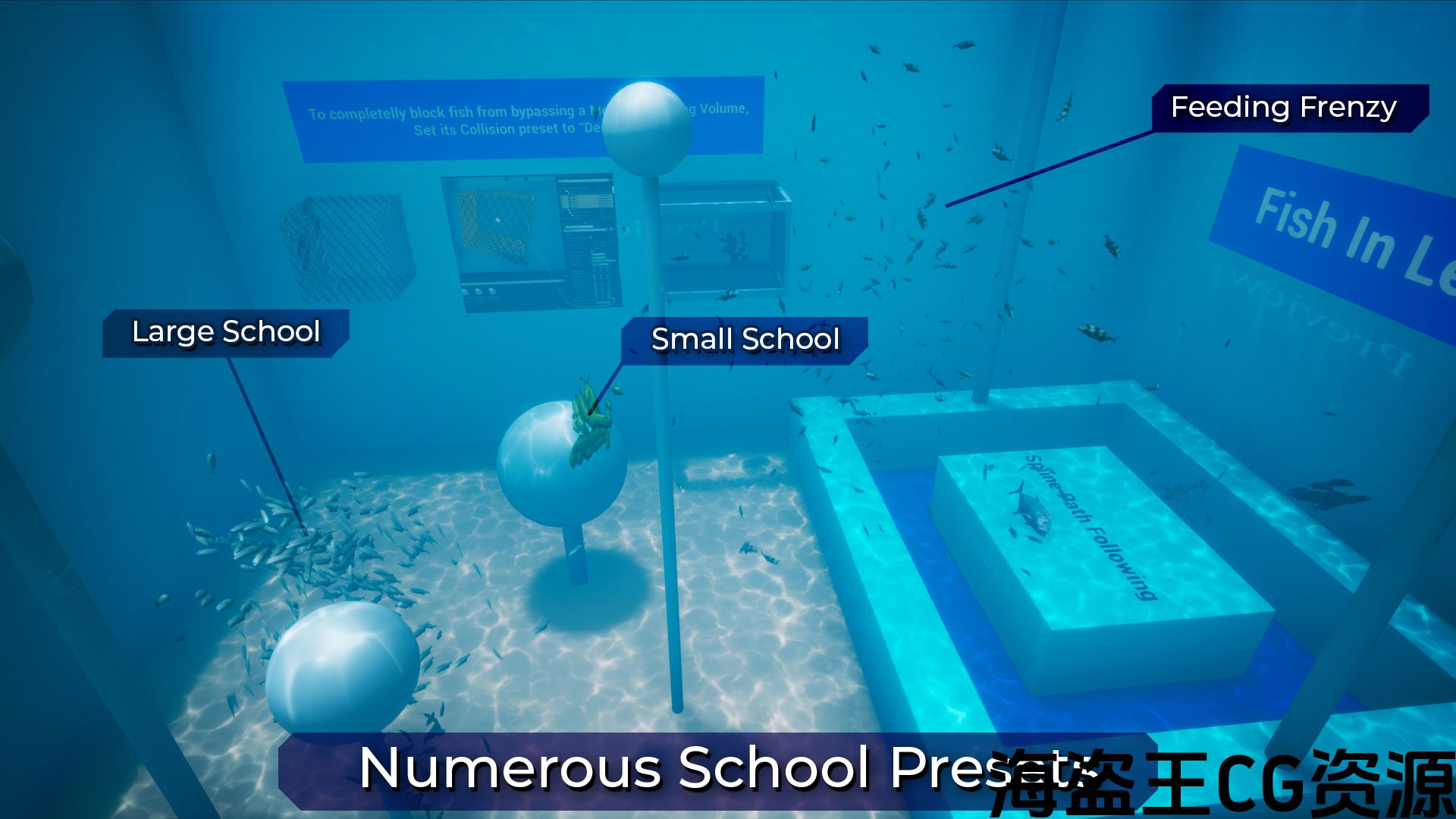 - 蓝图允许调整比例,颜色,动画速度,动画频率,切换自动动画或顶点动画,切换标准速度或动态速度,最小和最大速度和动画速度,鱼的数量,众多粒子学校设置,