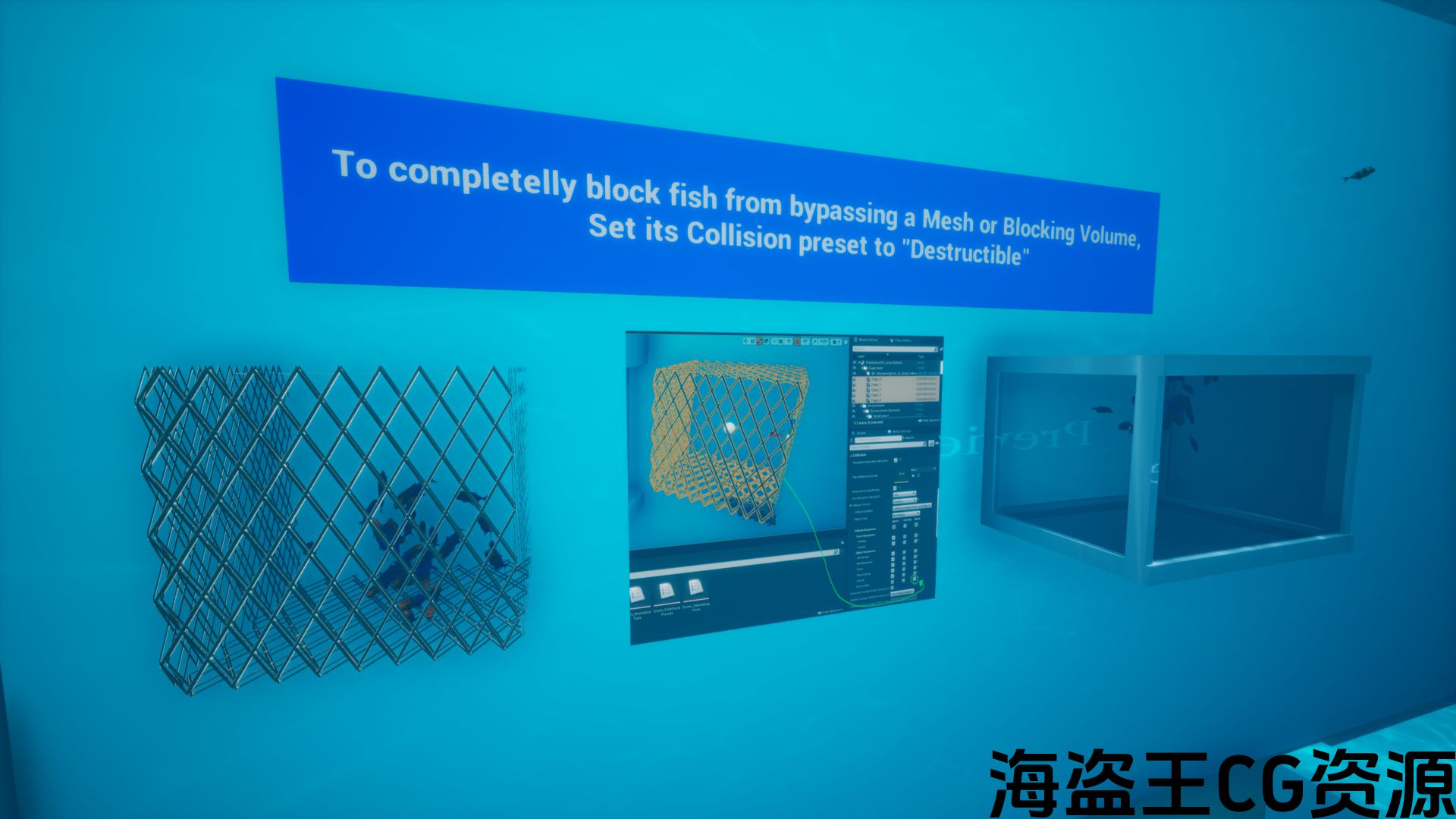 除了尼亚加拉粒子与静态和动态对象的碰撞之外,该系统还利用”可破坏”碰撞通道来允许玩家通过网格体而不让你的鱼通过它们。 只需确保您的静态网格体具有”可破坏”通道,并且您的鱼将与该对象发生碰撞。