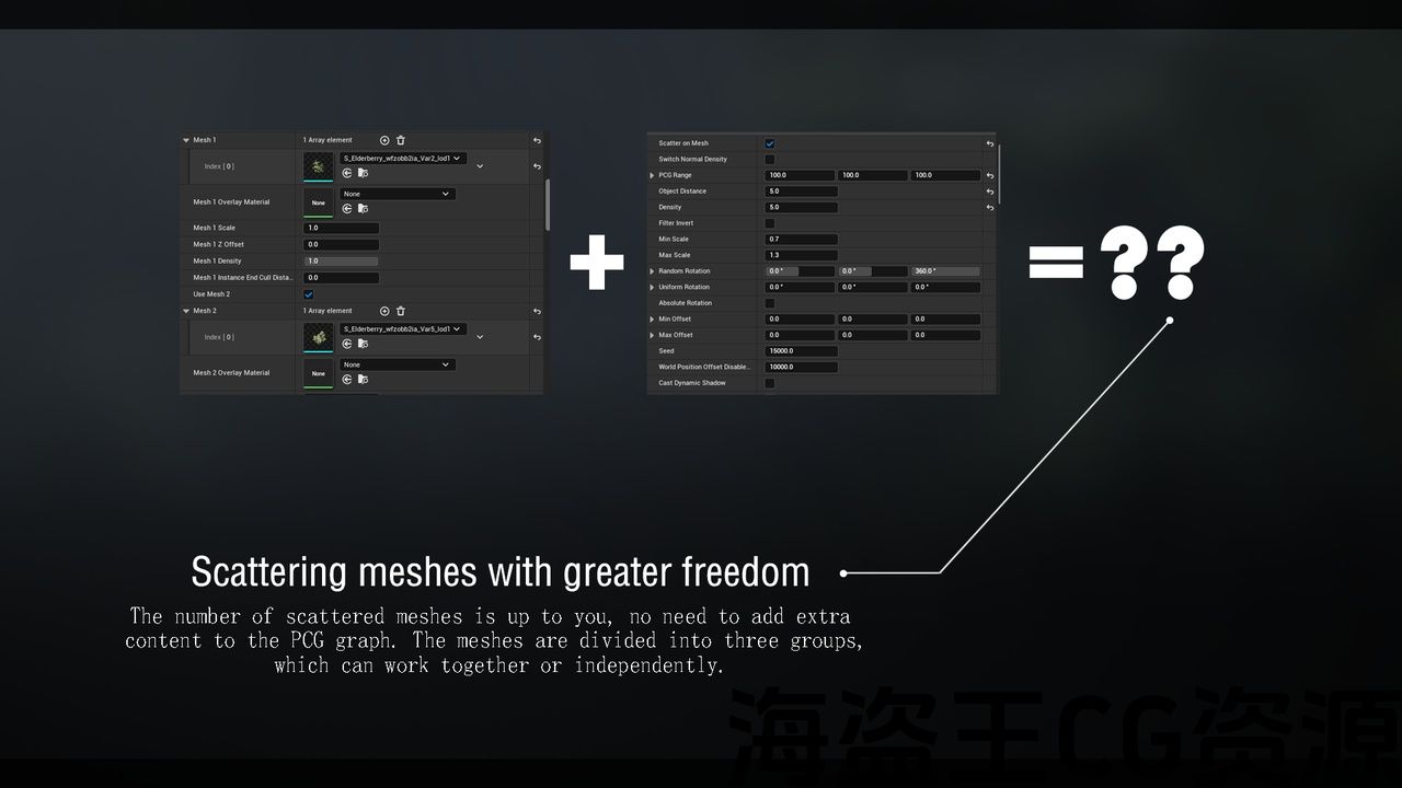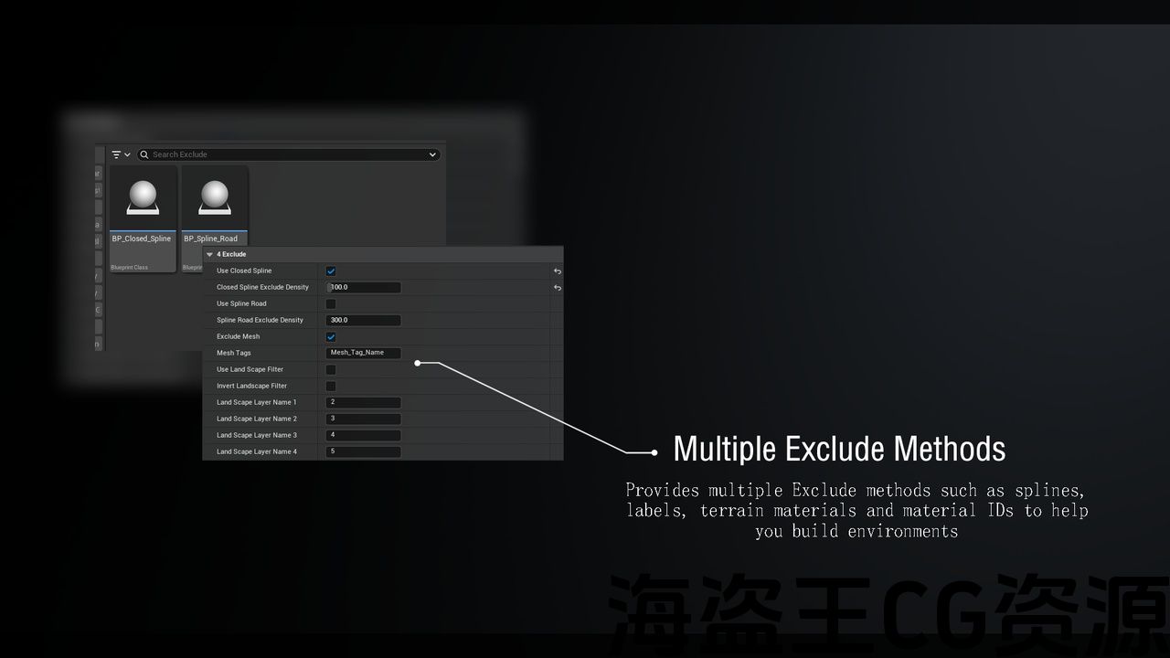 • Contains PCG blueprints that can be projected onto terrain or meshes and automatically adapted