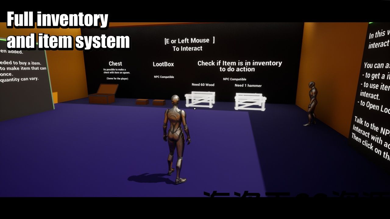 - Npc interaction : NPC can use items in the player inventory, pick items for the player and open the loot box.