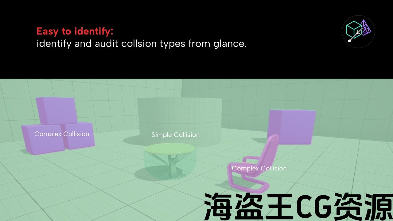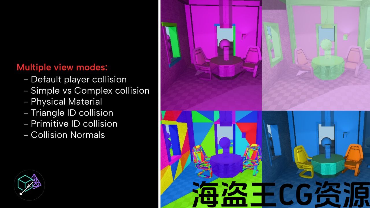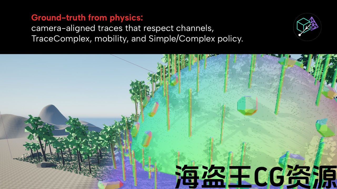 Accurate, real-time collision visualization by tracing actual rays in the scene (not the engine’s proxy) with temporal two-stage sampling for stability and speed. Six view types: Default, Normals, Primitive IDs, Triangle IDs, Material IDs, and Simple vs Complex (with collision policy tints).