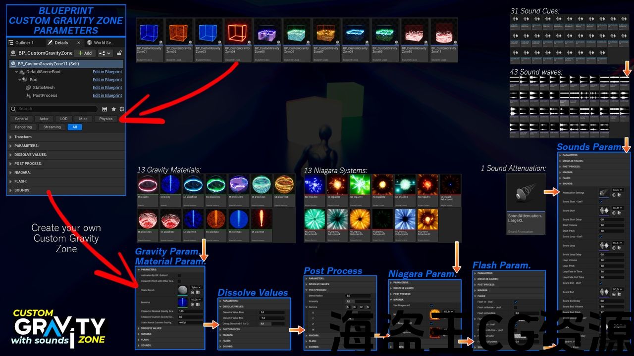 You can modify anything easily (Materials, gravity mesh shape, Niagaras, sounds, Post process).