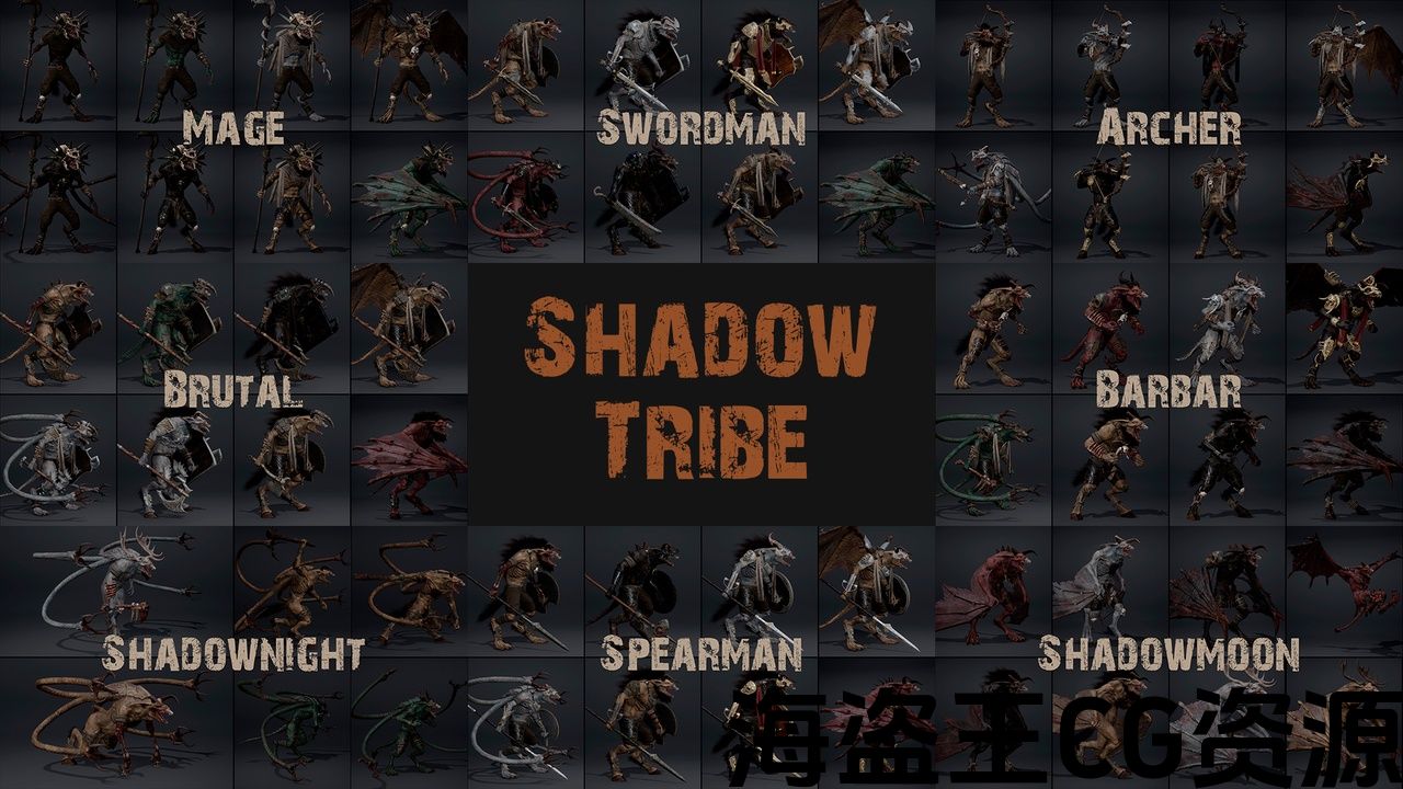 Includes 454 animations common to all members of the Shadow Tribe, as well as specialized animations of a Swordsman, Archer, Mage, Spearman, Barbarian, Brutal Knight.