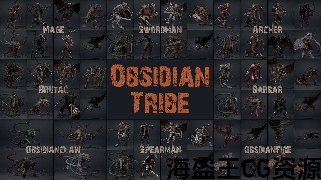 Includes 468 animations common to all members of the Obsidian tribe, as well as specialized animations of a Swordsman, Archer, Mage, Spearman, Barbarian, Brutal Knight.