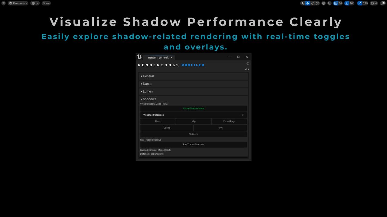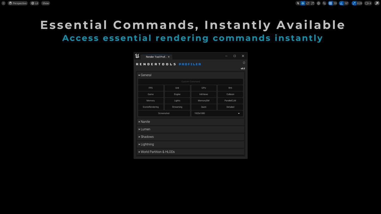 ✅ Category-Based OrganizationAll stats, view modes, and CVars are grouped into clean categories like Lighting, Shadows, Nanite, Lumen, and Mesh Optimization for intuitive access.