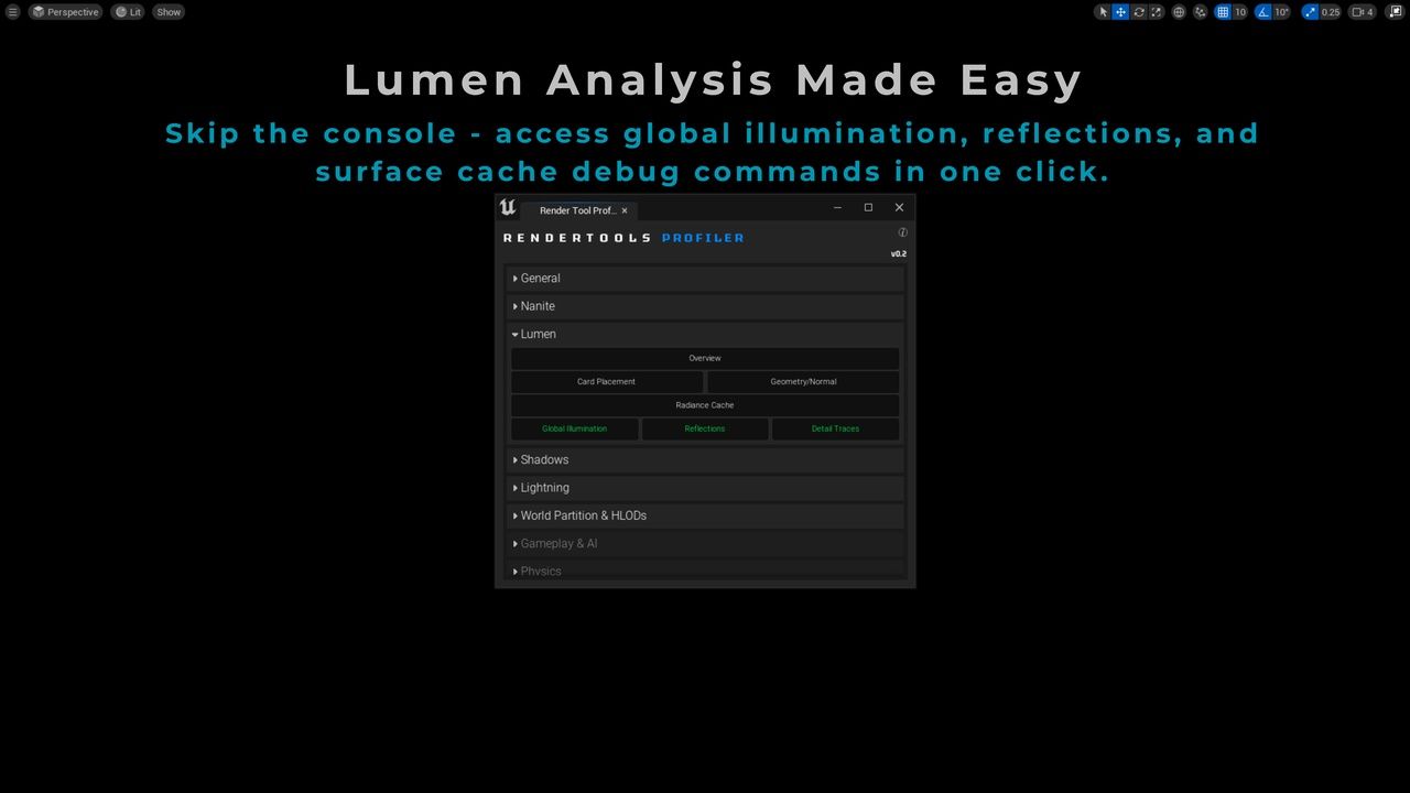 ✅ CVar Control Without the ConsoleQuickly change critical rendering CVars (e.g., Lumen reflections, shadow quality, r.Shadow.Virtual.EnableCulling) through dropdowns and sliders – no more guessing syntax.