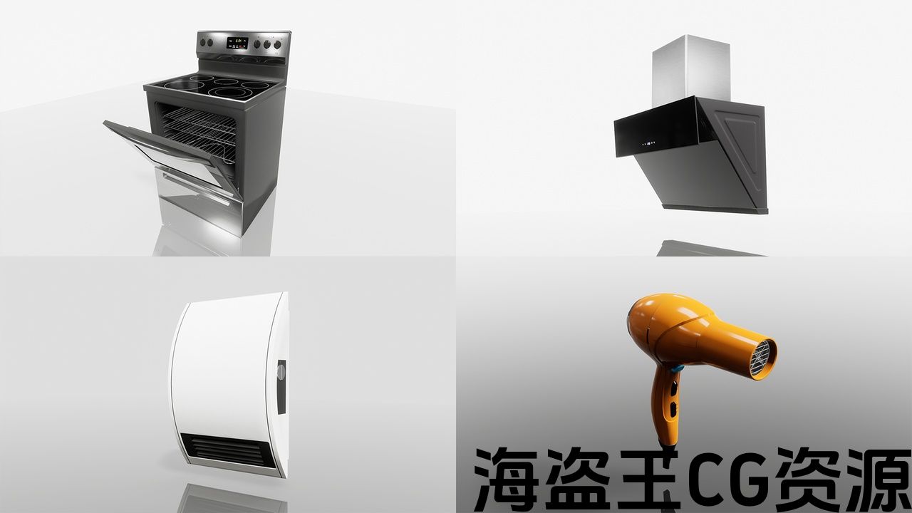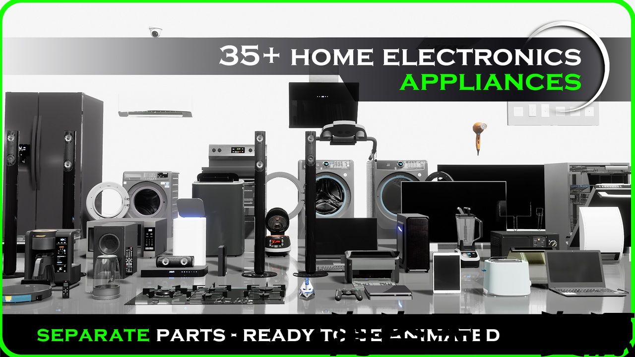 Electronic devices in the pack: Air conditioner, Cassette air conditioner, Portable air conditioner, Blender, Camera, Coffee Brewer, Dishwasher, Dryer, Electric outlet (3), Electric range, Gas cooker, Hair dryer, Heater, Hood, Induction hob, Iron, Kettle, Laptop, Microwave, Oven, Keyboard, Mouse, PC case, PC screen computer desktop, Printer, Game Station, Refrigerator, Rice cooker, Speaker, Switch (3), Tablet, Toaster, Trash bin, Treadmill, TV (flat screen), TV (curved screen), Vacuum cleaner, Washing machine 01, Washing machine 02, tv.