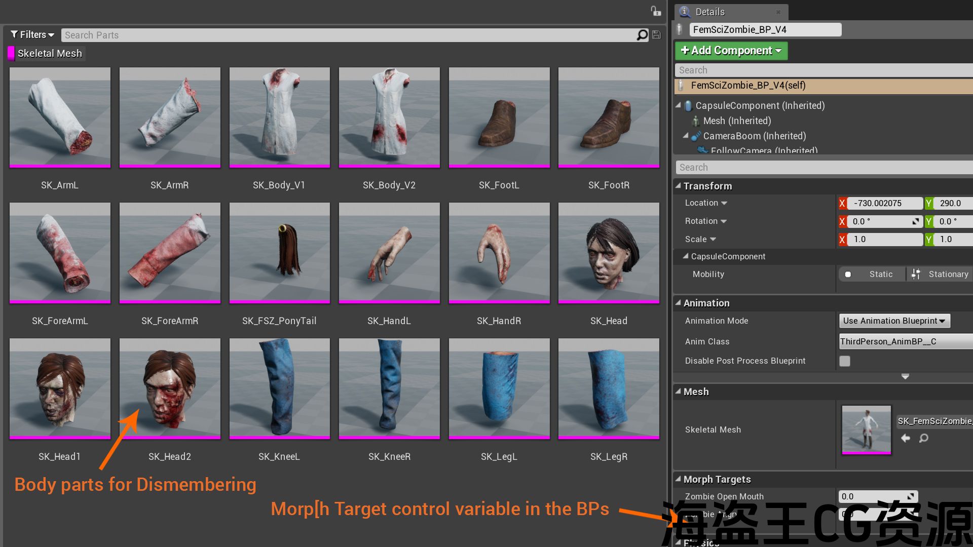 Models also have Zombie Open Mouth and Zombie Angry Morph Targets, with variables to control them in the BP.