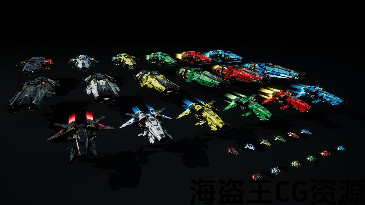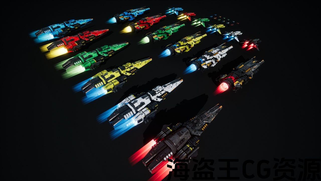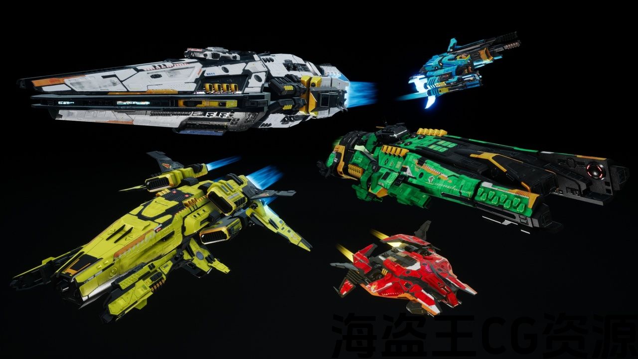 Each ship is available in 5 customizable colors—Black, White, Red, Blue, Yellow, and Green—easily modified using the blueprint integer system.