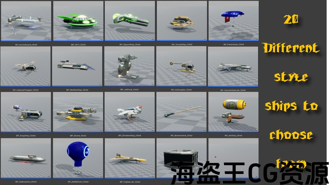包括一个主蓝图,可以将其复制为子蓝图并进一步编辑以创建自定义飞行器。螺旋桨动力学系统、碰撞系统、降落伞等等。