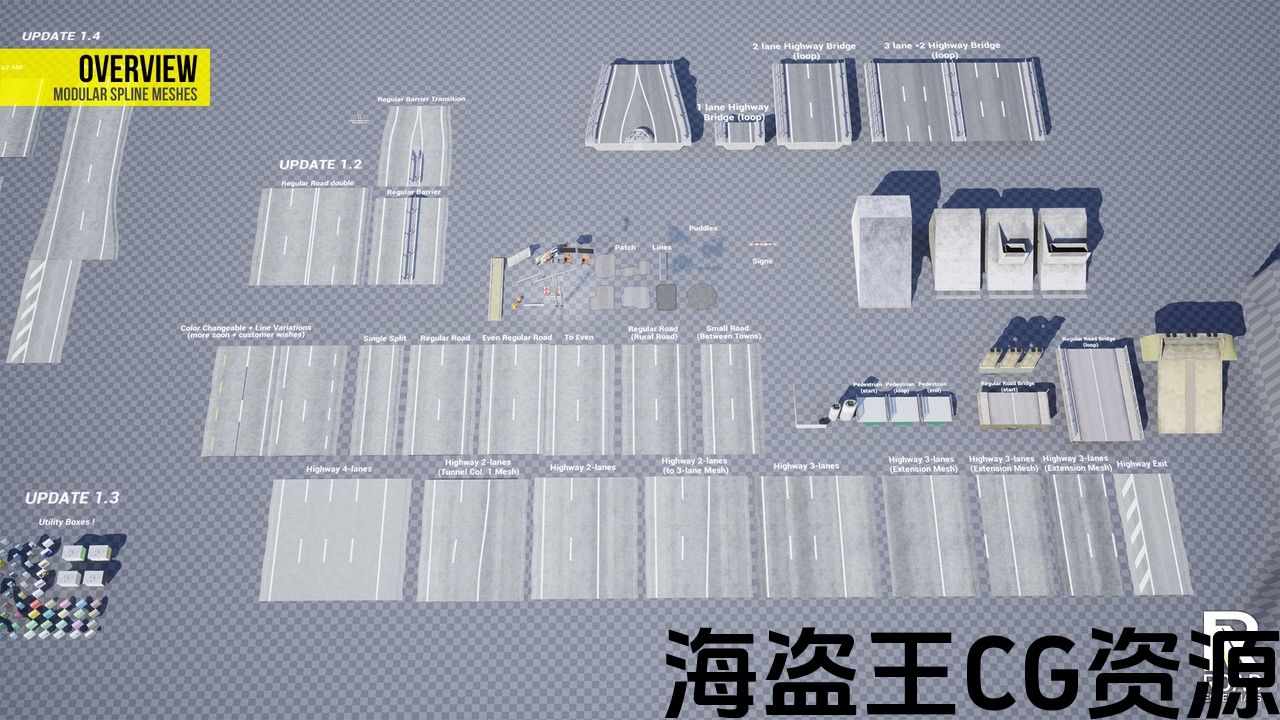 • Included: 1x Lantern, 1x Arrow Board, 1x Delineator, 1x Curb, , 2x Billboard, 3x Guardrails, 10x Pylons, Asphalt Patches, Puddles, 6x Signs, 17x Bridge Pieces, 9x Highway, 4x Default Road