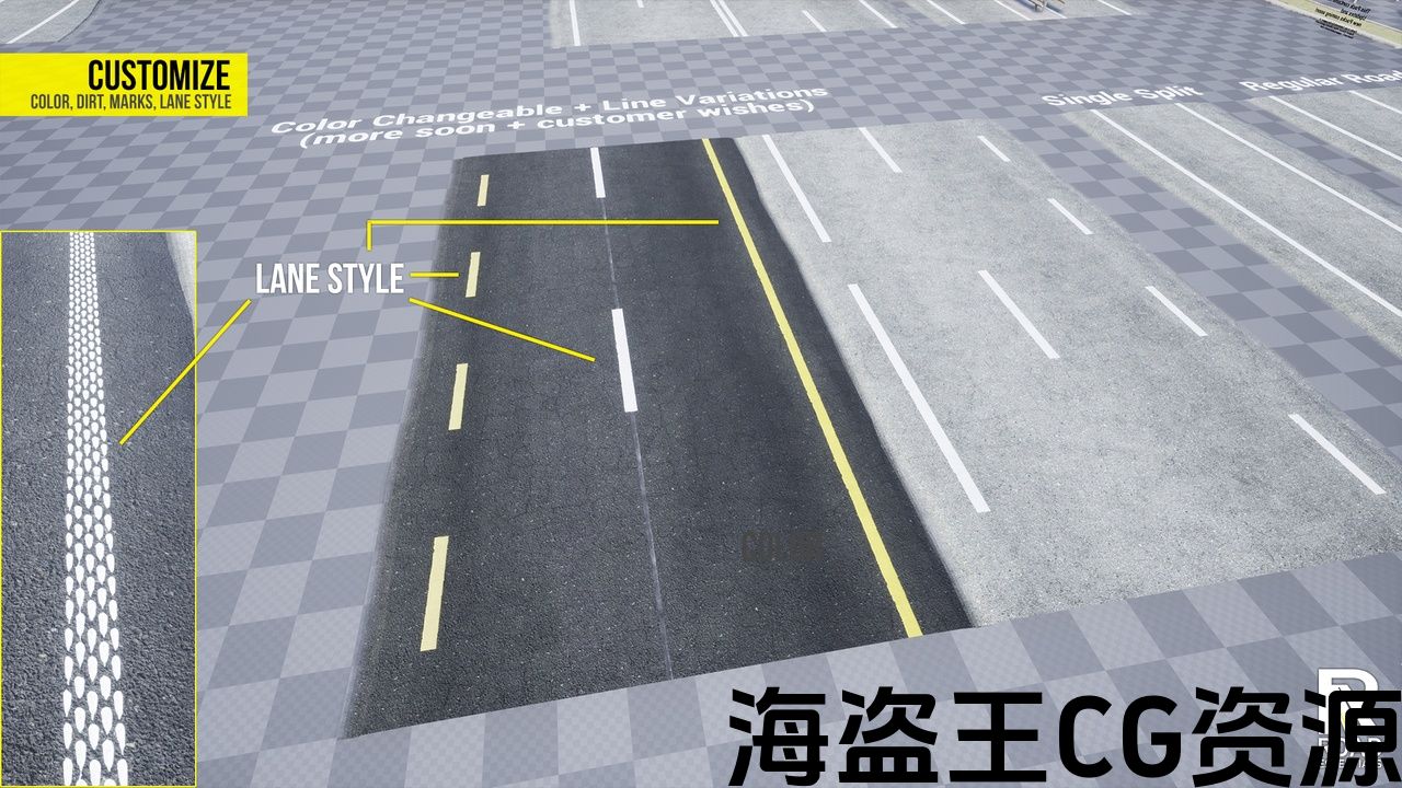 可以。您可以更改颜色、使用标记、污垢和裂纹强度。您也可以使用自己的道路材料,还可以自定义车道标记。