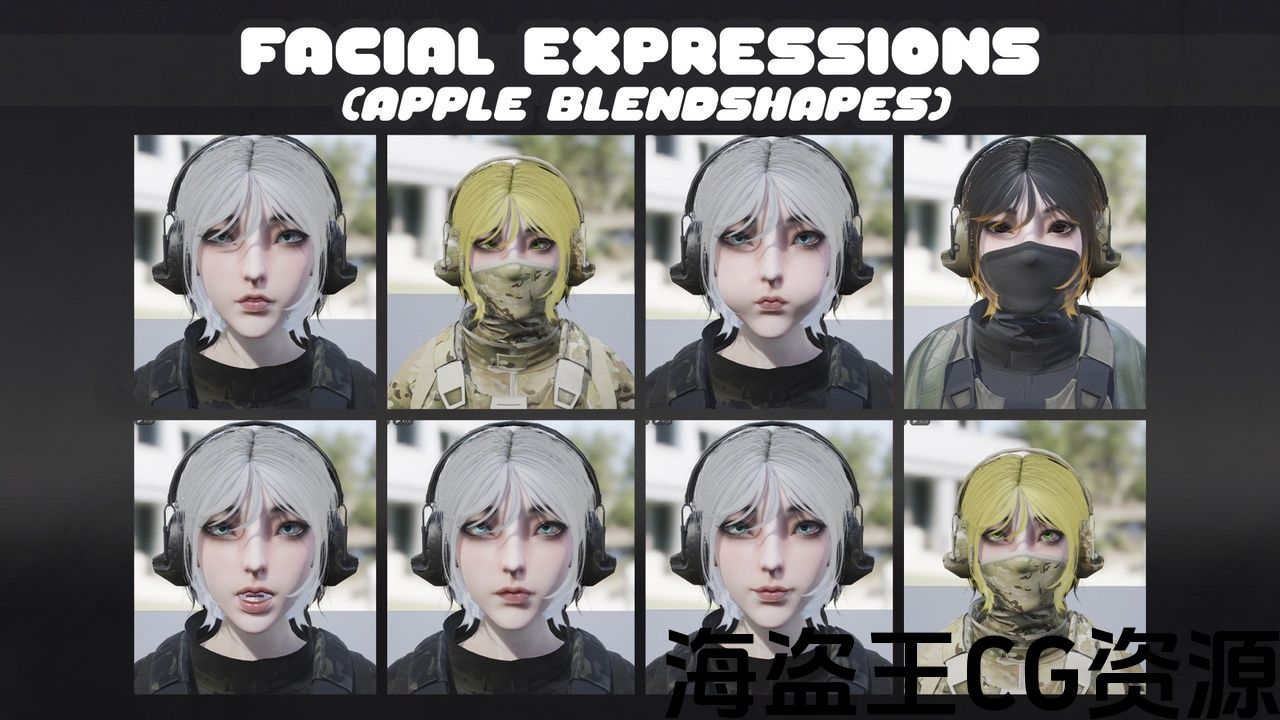 • 面部具有所有苹果 AR 混合形状(ARKit) 并准备好进行面部动画。