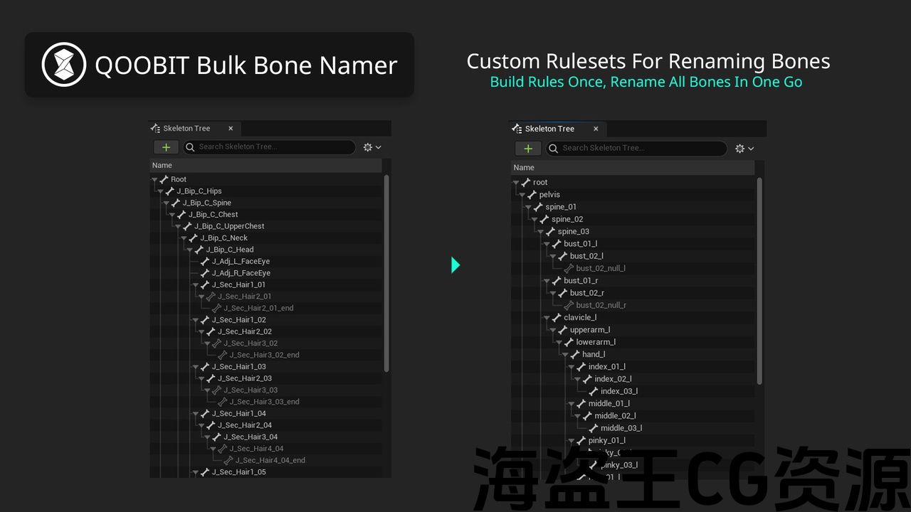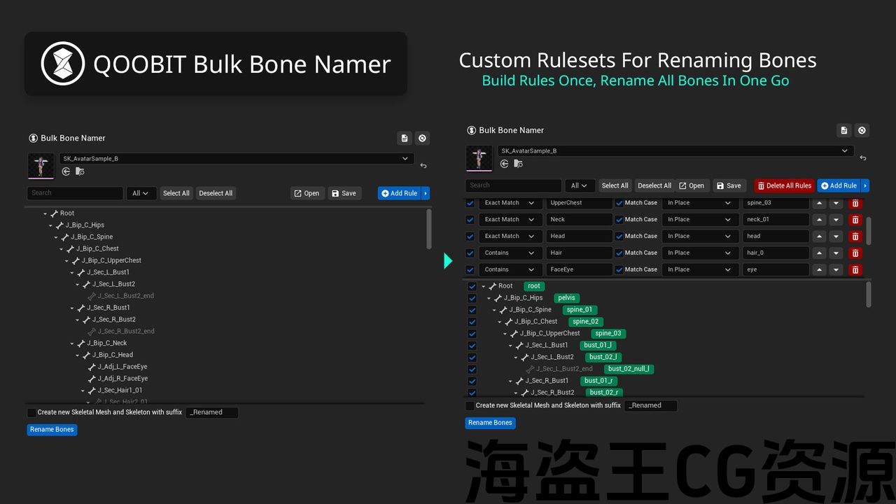 此批量工具允许您定义复杂的自定义规则集,以便通过前后预览来重命名骨架。通过按顺序定义的规则,您可以预览每个附加规则的效果,甚至可以保存规则以供将来使用。这修复了常见情况,例如不遵循左 (_l) 或右 (_r) 后缀规则的装备,或者使用与引擎中常用的标准化骨骼名称不同的装备。