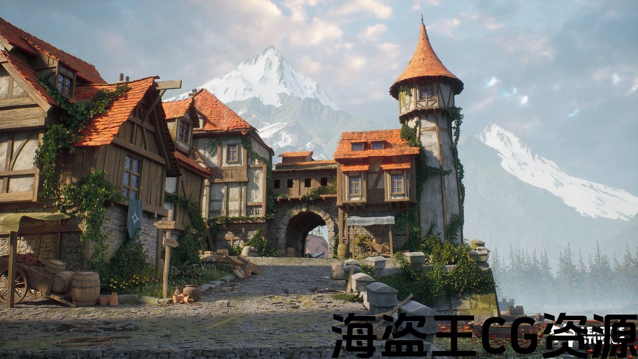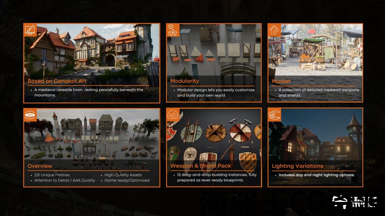 中世纪湖镇环境,拥有 231 个独特的网格。包括所有展示资产,以及优质资产。具有良好的细节水平,并针对 Game Ready 项目进行了优化。