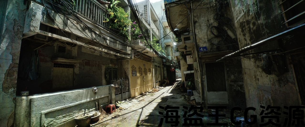 在虚幻引擎 5 中运行的虚构西贡小巷网络。该场景使用自定义摄影测量扫描构建,并利用 Lumen 和 Megalights 进行动态照明。它依靠传统的非 Nanite 工作流程来确保标准游戏性能预算的优化。