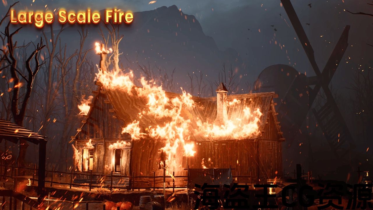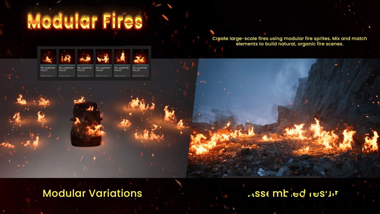 大型火灾由模块化的火灾元素组成,可以混合、复制和分层,以创建大规模的野火、燃烧的田野、废墟或破坏场景。构建有机的、非重复的火灾布局,而不是依赖单一效果。