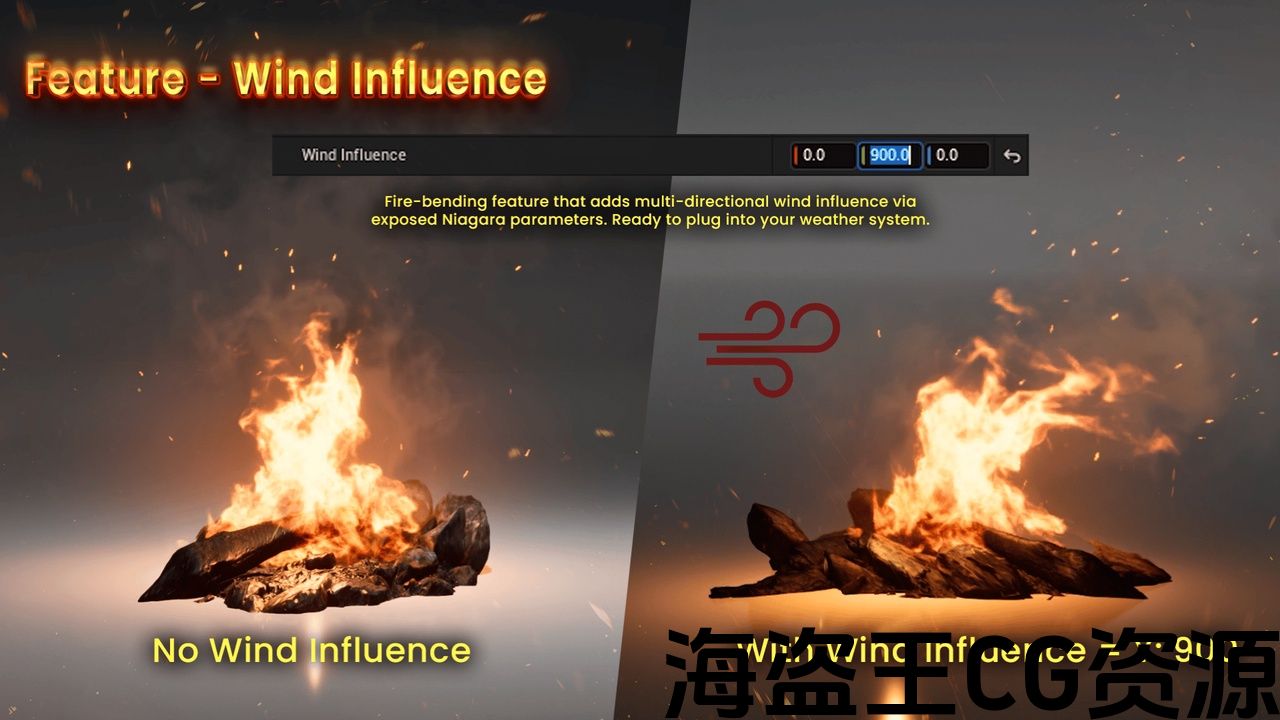 火灾通过暴露的 Niagara 参数对多向风做出反应。火焰根据风的强度和方向自然弯曲,可以直接插入动态天气系统。