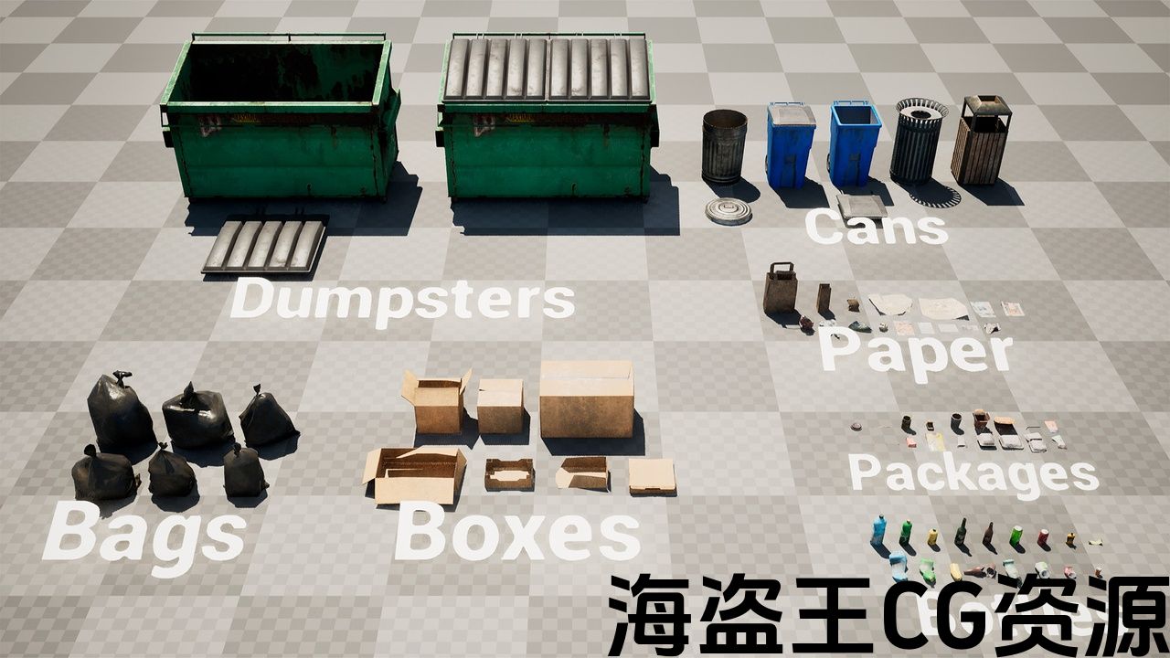 该包包含垃圾桶和垃圾箱、垃圾袋、空包装、瓶子、纸张以及创建逼真环境所需的其他元素。