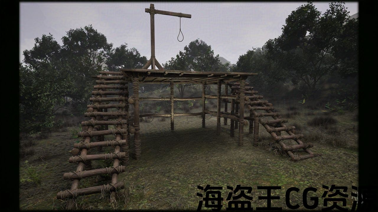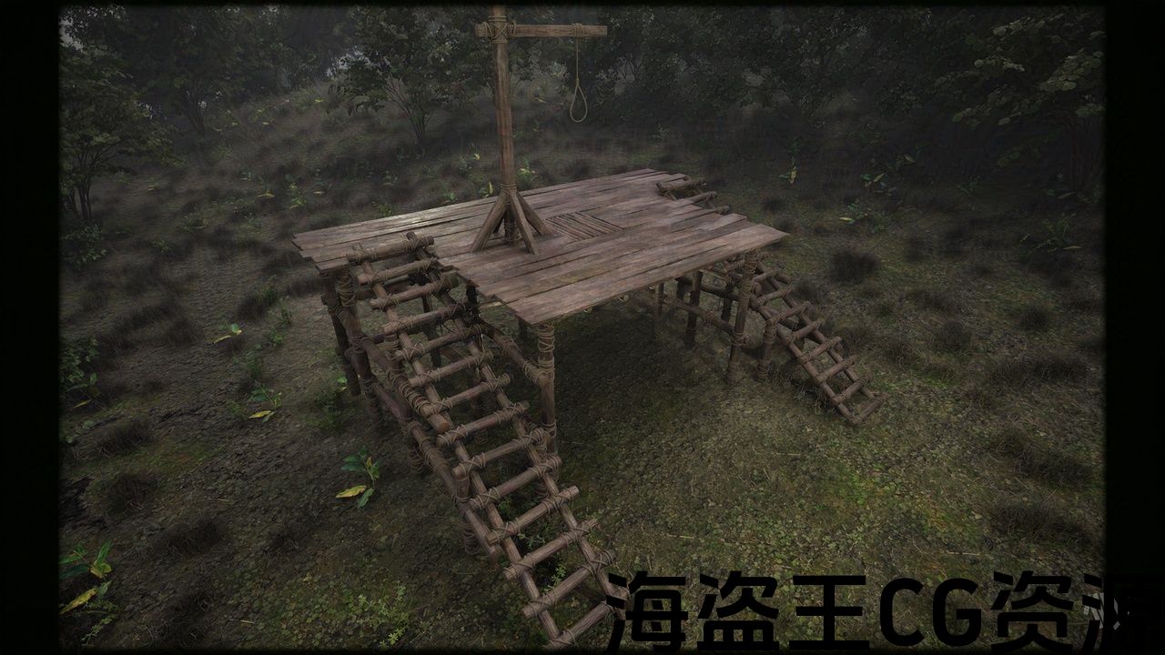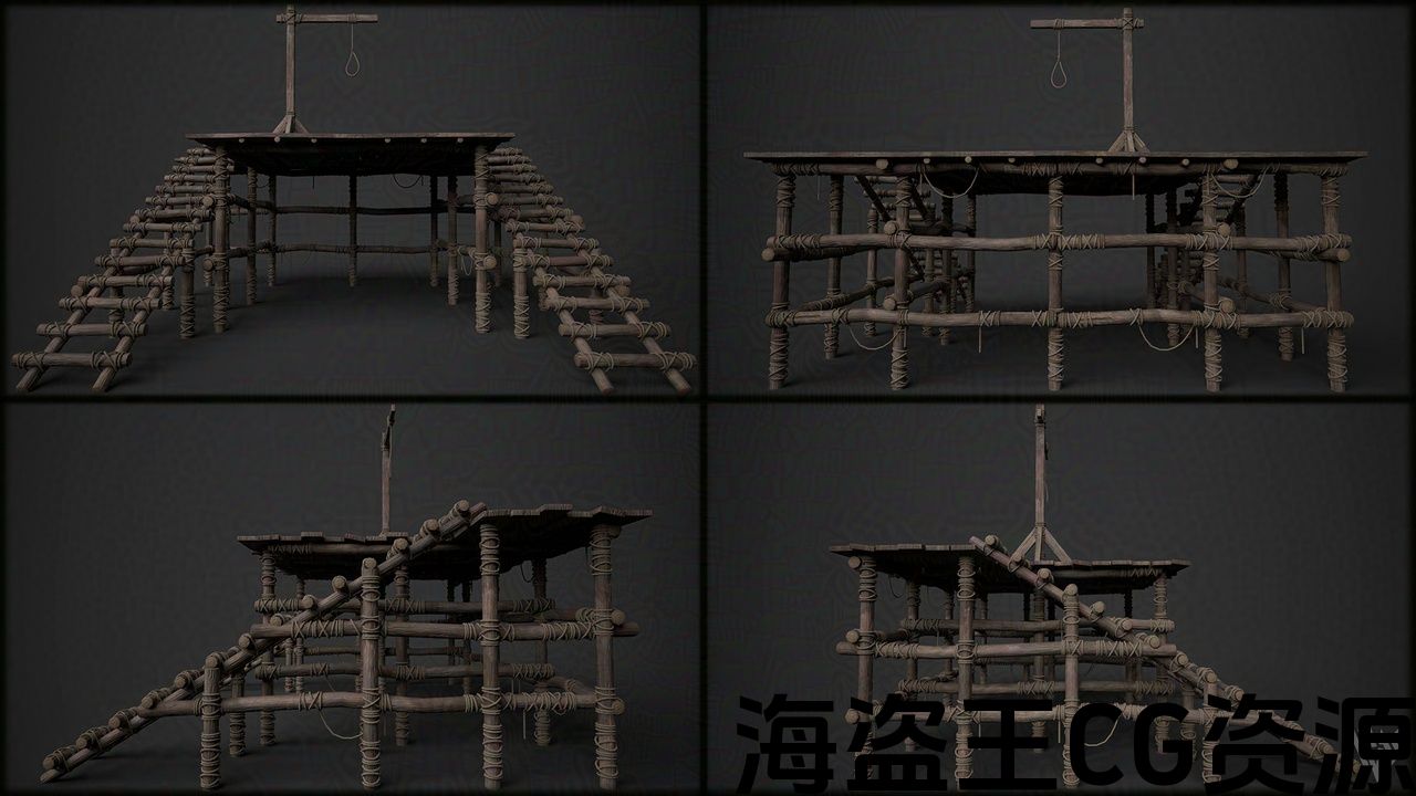 木制舞台绞架。适合描绘中世纪场景和公共执行等的道具。在 Maya 中建模并在 Substance Painter 中进行纹理化。