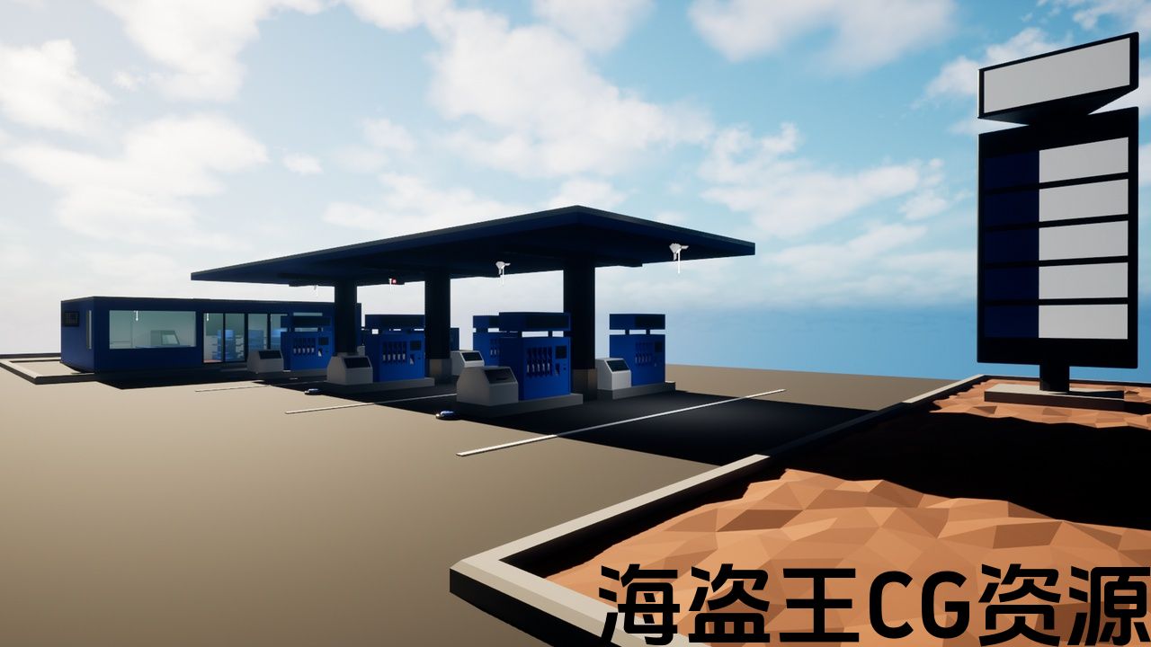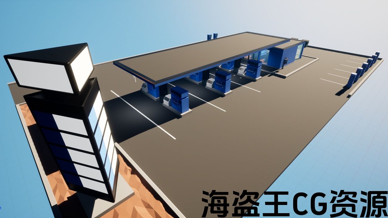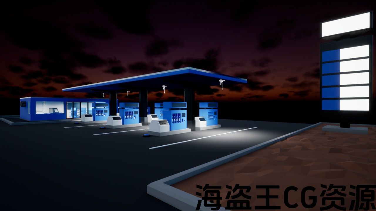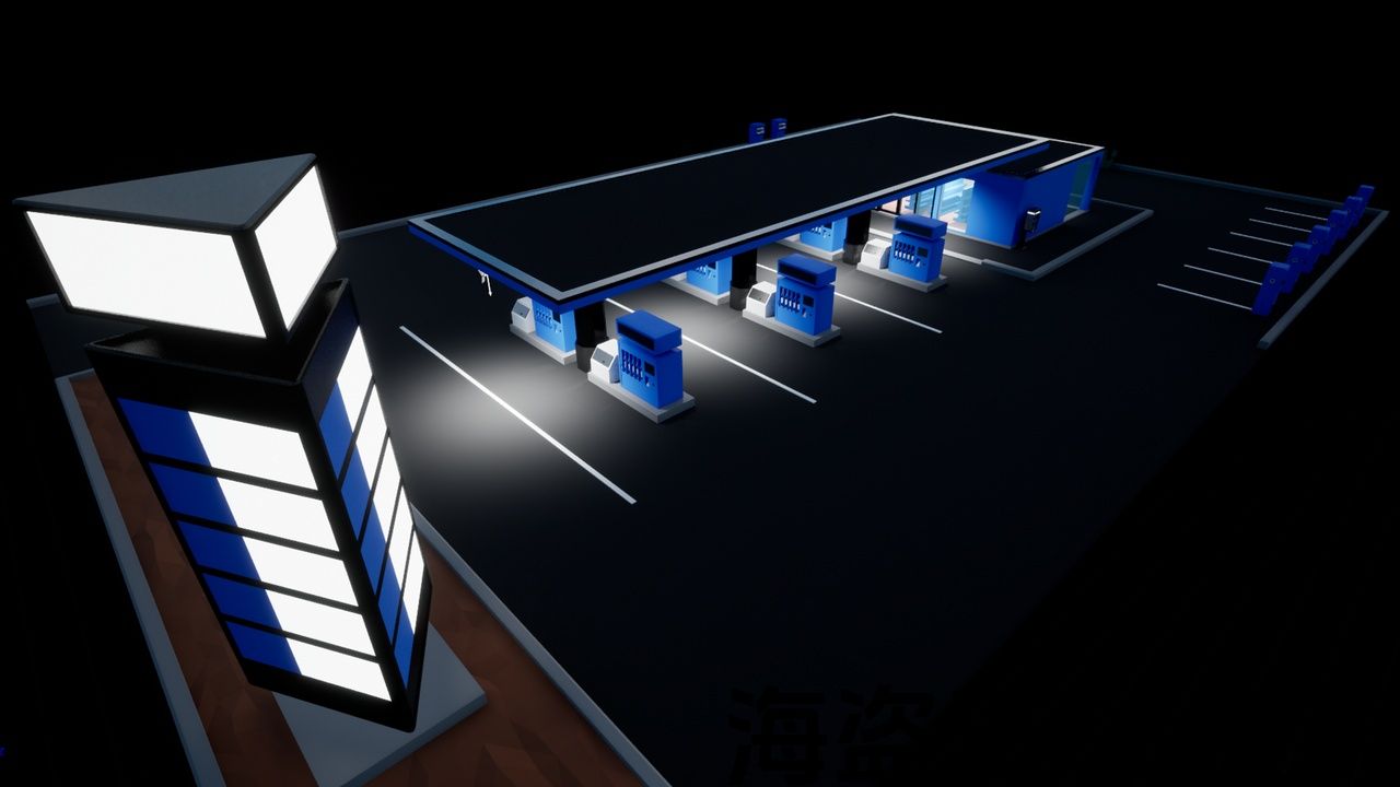 场景中包含以下对象:加油站的沥青平台、带有屋顶组合成一个网格,三角形广告牌,各种门,窗玻璃,垃圾桶,用于向轮胎充气的压缩机,电动加油站(用于电动汽车充电),各种架子和食品架,沙发,电视,报纸桌,杂货柜台,咖啡机,外部空调机组,电话亭(公用电话),水槽,马桶,卫生纸,柱塞,镜子,毛巾挂钩,干手器,汽车加油站。
