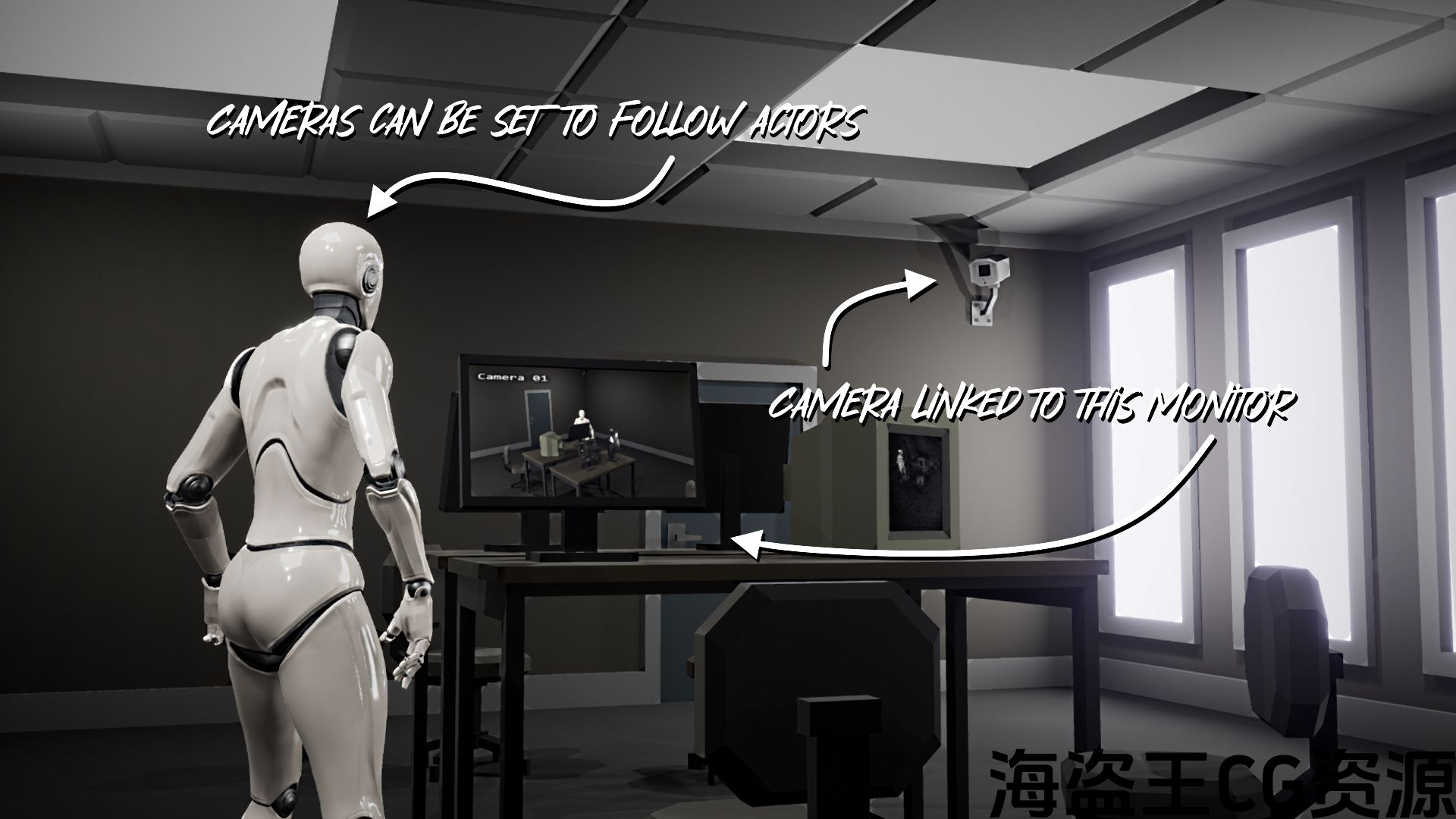 This is a camera system that allows the developer to easily add to a level any type of camera that realistically transmits video feed to an in-game screen. All it takes is to place a screen and a camera and then linking them. You can then customize how you want the video feed to look, set your own meshes or make the camera follow a certain actor.