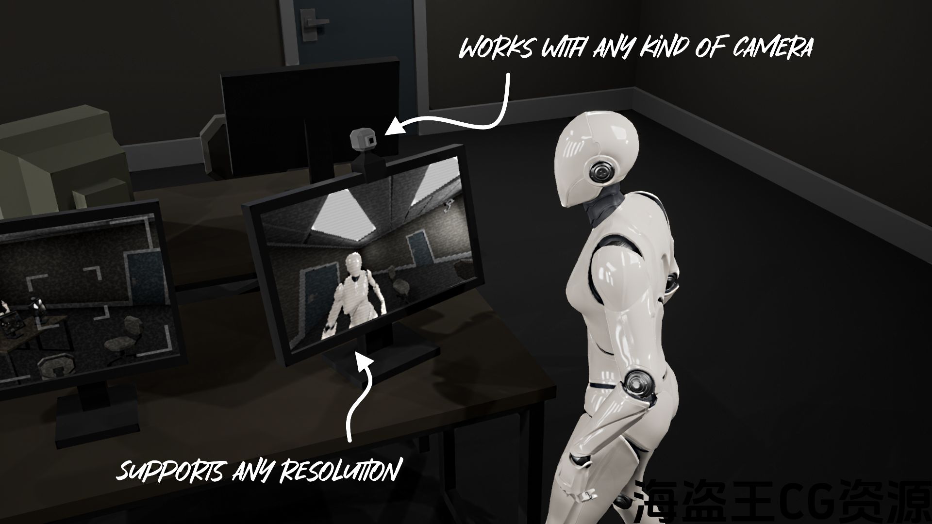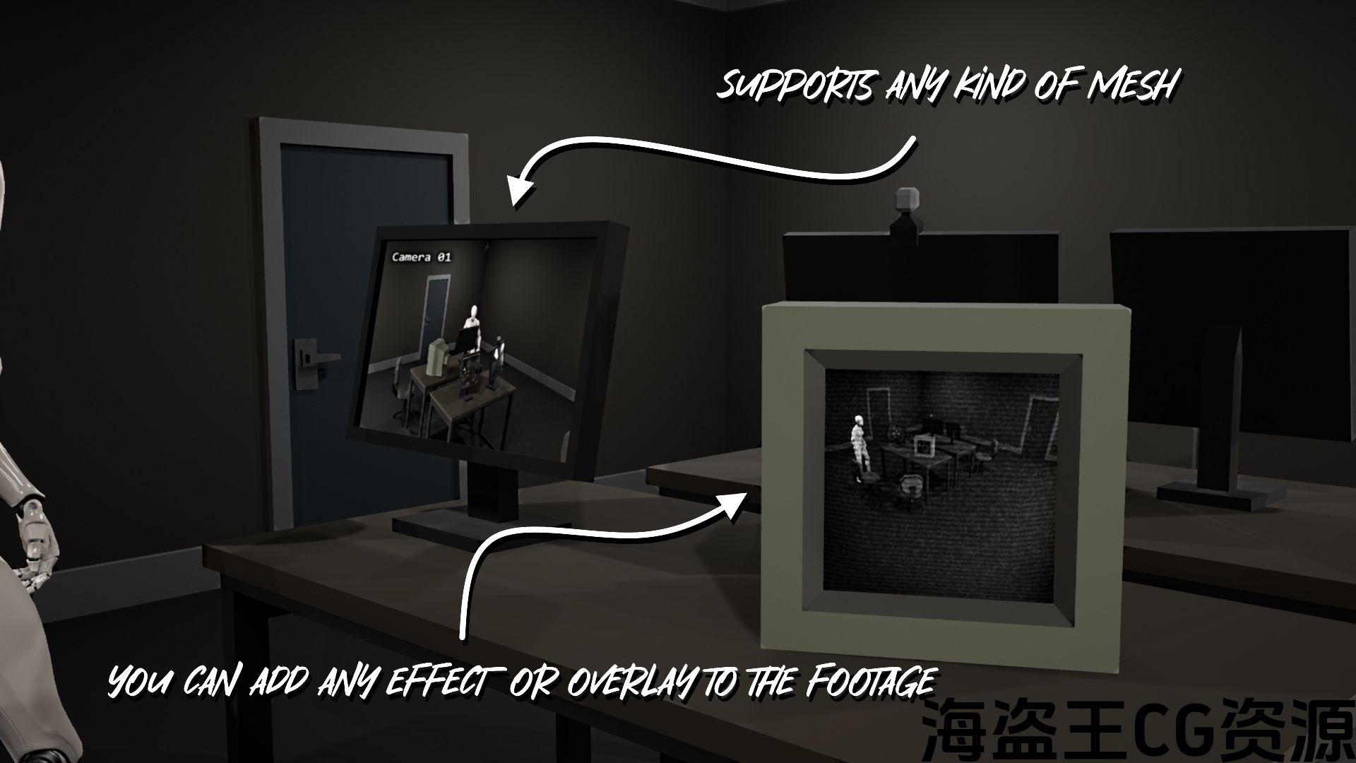 - Easily implement your own camera and monitor meshes