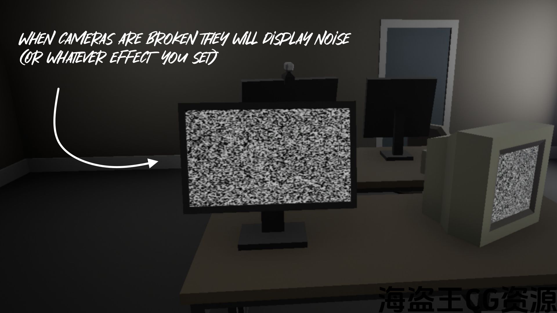 - Cameras will break when damaged and display noise in the video feed (Can be changed to any effect you want)