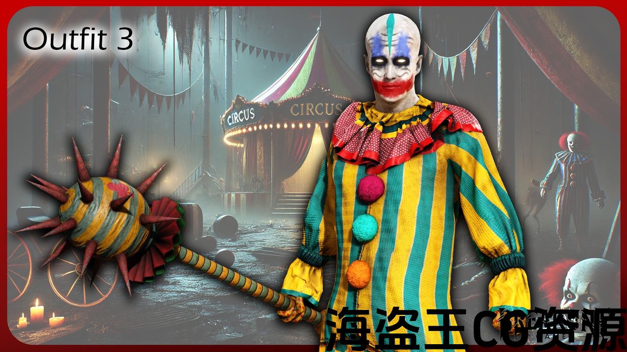 又脏又破的红色和米色竖条纹,沾满血的腿,戴着蕾丝边的手套,戴着条纹高顶帽子。这个小丑看起来就像是直接从废弃的帐篷里走出来,非常适合更加接地气的恐怖场景。