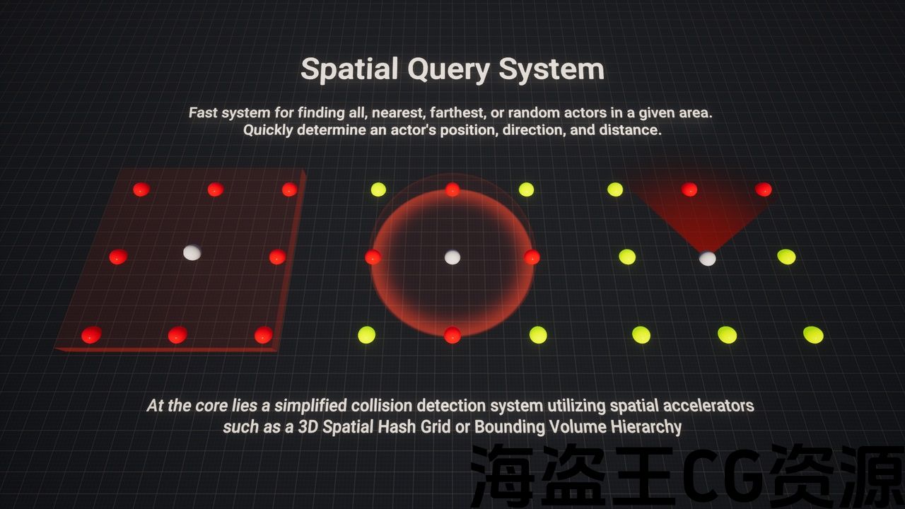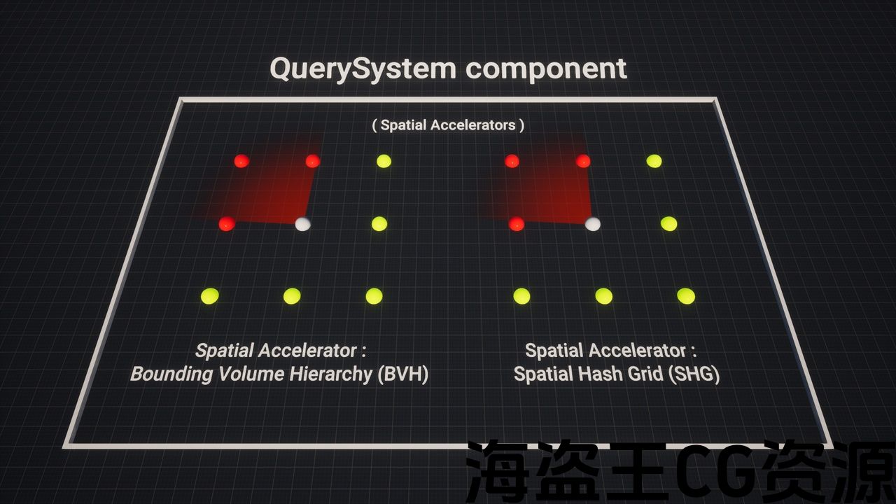 空间查询系统的核心是简化的碰撞检测系统,利用 3D 空间哈希网格或边界体积层次结构等空间加速器。