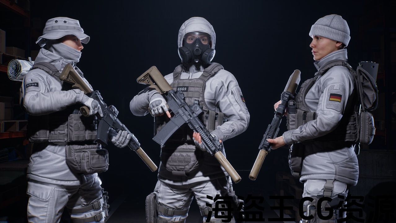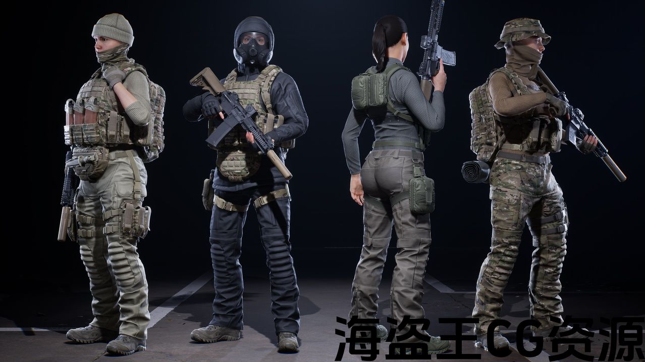 角色分为7套:身体[头、躯干、手臂、手、手臂、脚]、裤带靴子、夹克、手套、卸料、小袋[每个小袋都有一个版本AR 和 AK mags]、设备和头部装备。