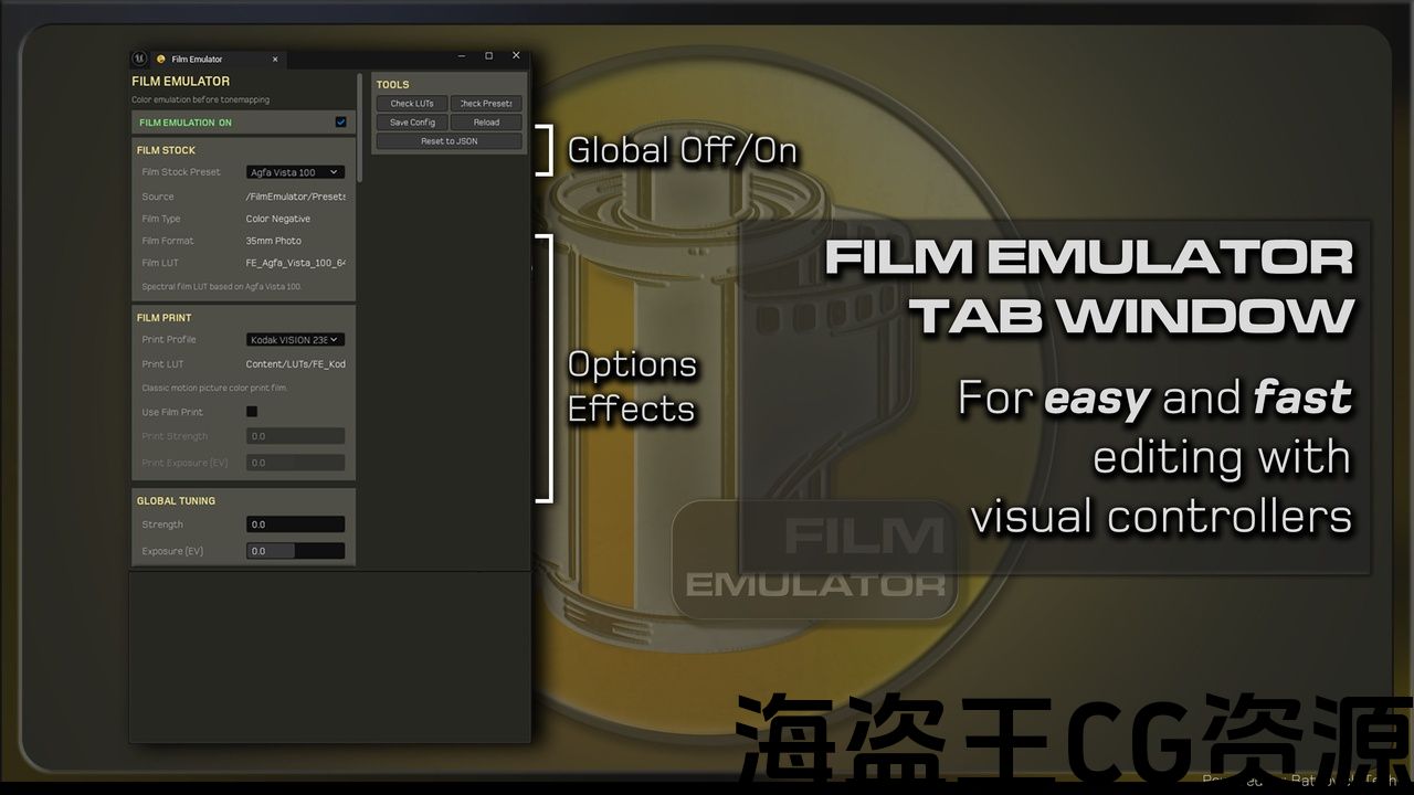 FILM EMULATOR 包括一个专用的“工具”选项卡,其中包含实时控件、预设/打印选择、LUT/预设检查以及一键保存/重新加载配置。