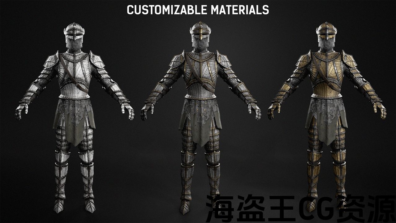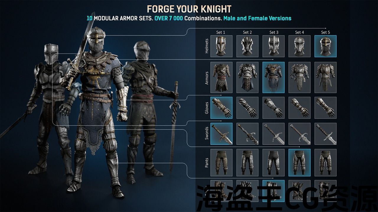 独立的模块化角色部件(头盔、盔甲、裤子、头部、手套、靴子)。