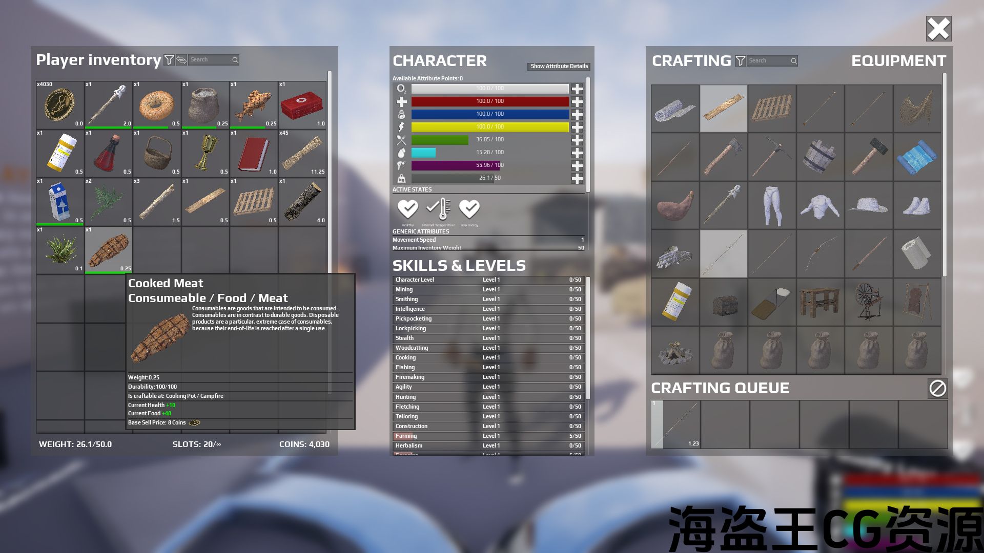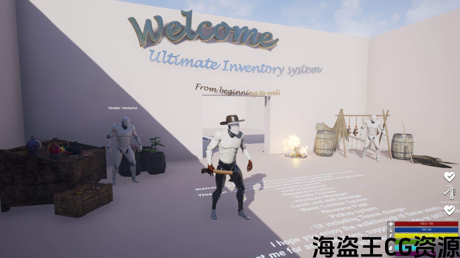 The most complete inventory system perfect for Survival / RPG / OpenWorld games. It includes: Inventory, Crafting, Equipment, Vendors, Attribute manager, Level and skill manager, Resource pack, Pickup system, UI, Excel spreadsheets, and more!