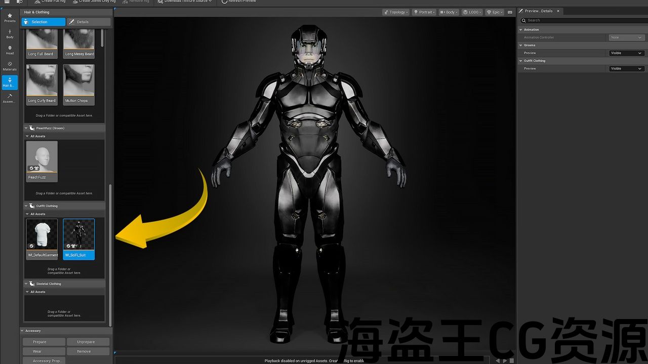 将 WI_*** 资源拖到 Metahuman Creator 中的“服装”部分,然后双击以应用它。