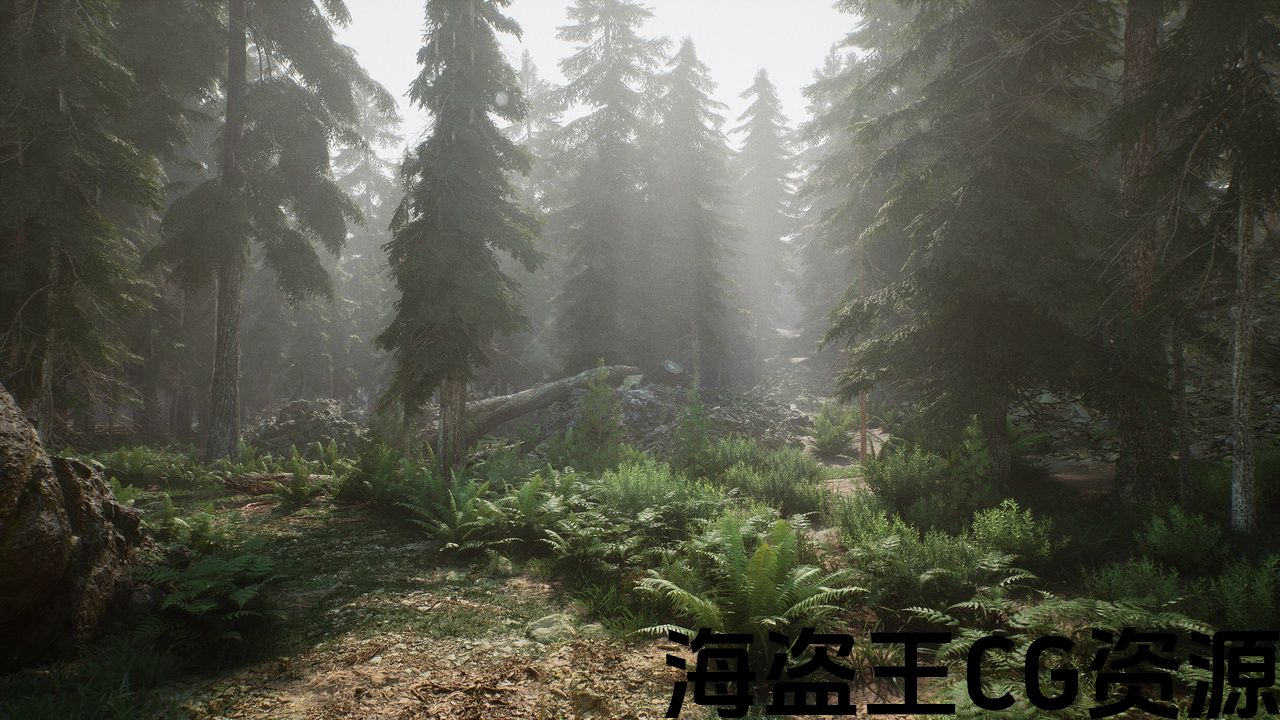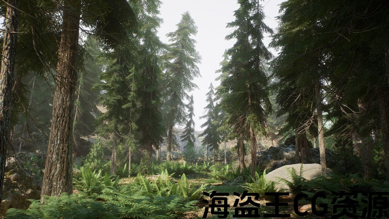 下一代树叶和植被:具有各种高保真英雄松树、茂密的蕨类植物簇、阔叶树苗和对风和光产生自然反应的地被植物。