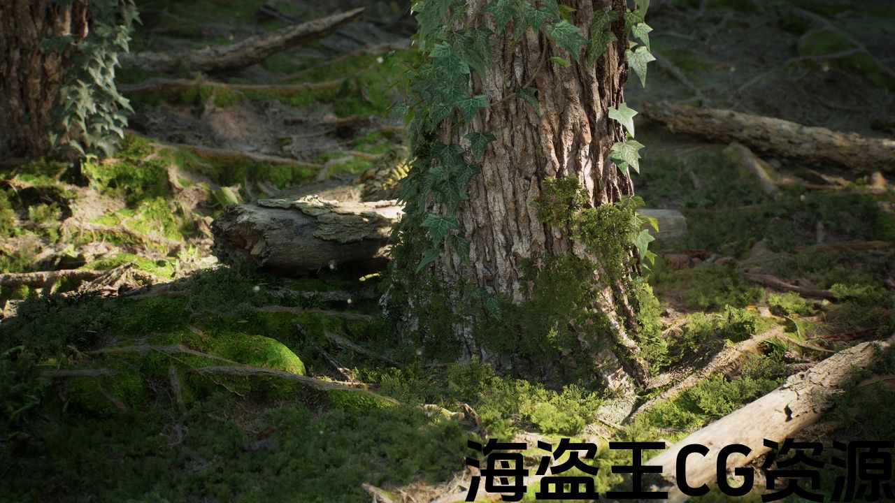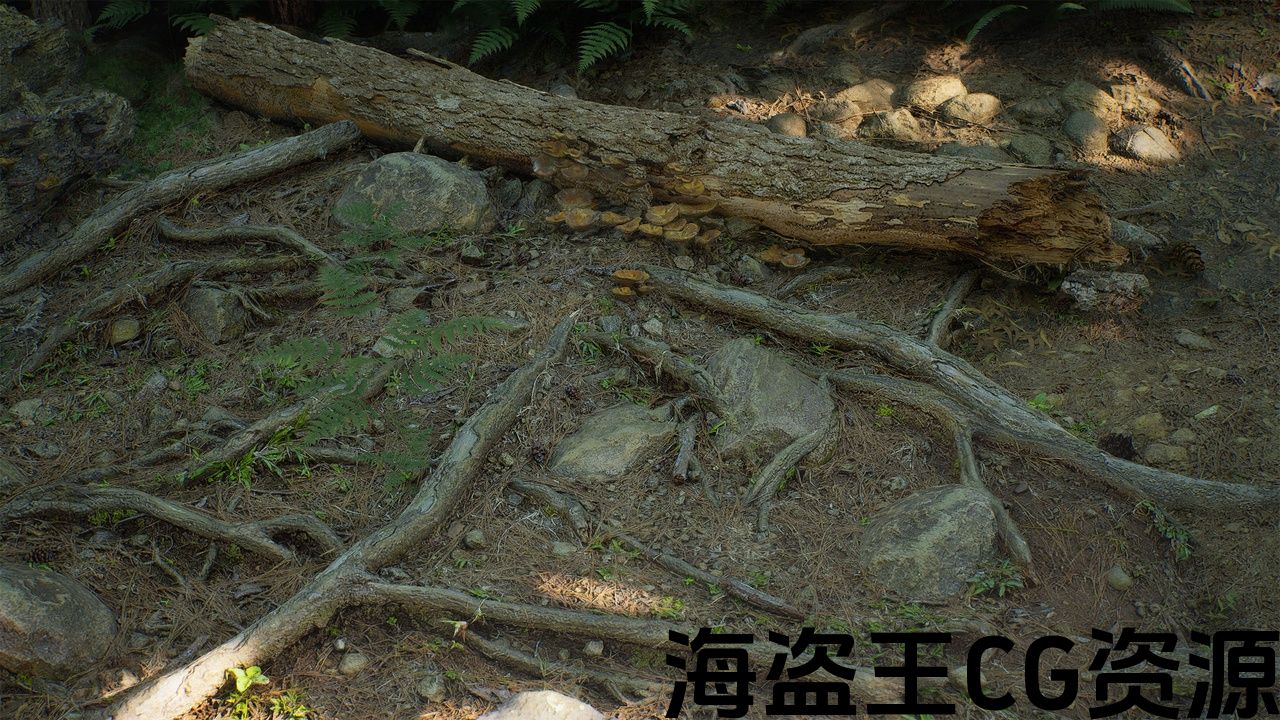 超现实地形和分散:用高度详细的根系网络、分散的松针、泥土和碎片建造可信的小径和森林地面。