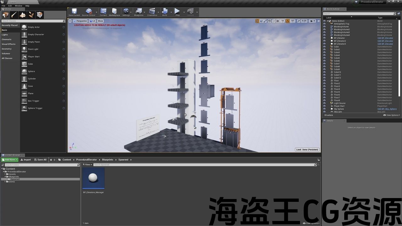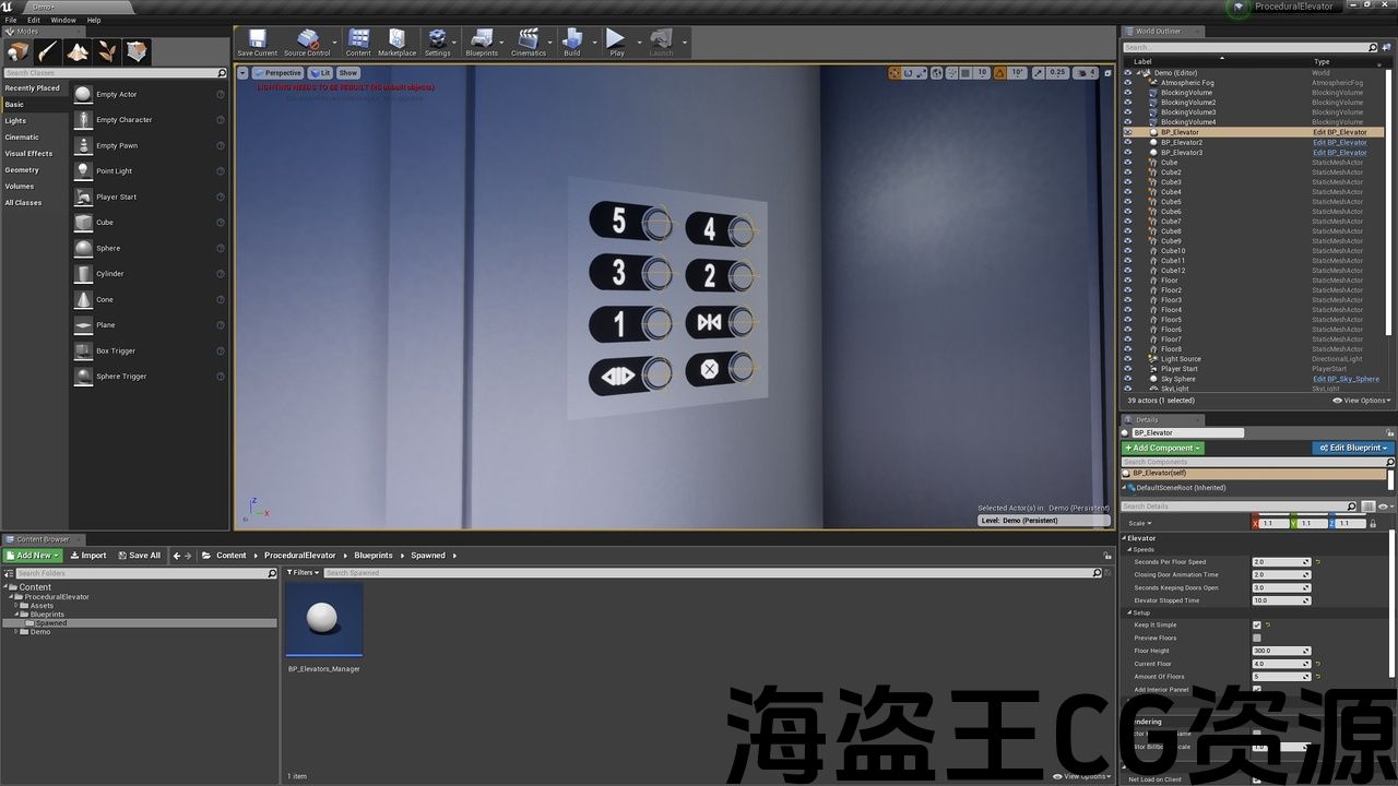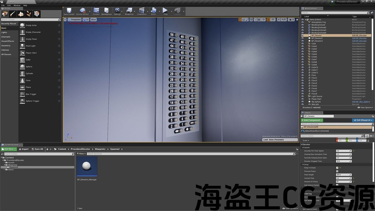 此电梯蓝图旨在根据几个简单参数(如楼层高度和楼层数量)生成电梯并为其设置动画。 您还可以更改一些”关键速度”,并具有程序生成的内部面板(仅限于50楼层),功能齐全但仍可根据您的需求进行自定义,从网格到触发方法(尽管这可能需要 它还包括一个材质,它使用单个纹理以程序方式生成高达999的数字。