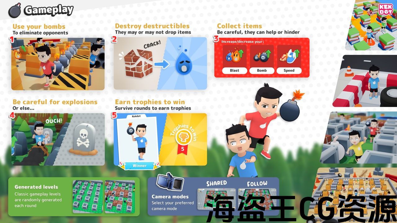 多种游戏模式预置-自上而下的角色-基于网格的炸弹生成功能-4个定向爆炸功能-随机生成的级别-在玩家创建的级别上播放-功率起伏-观众系统-玩家能力-死