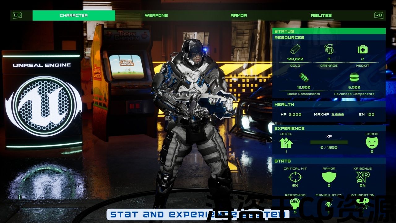- 玩家屏幕有四个选项卡:角色,武器,盔甲,能力