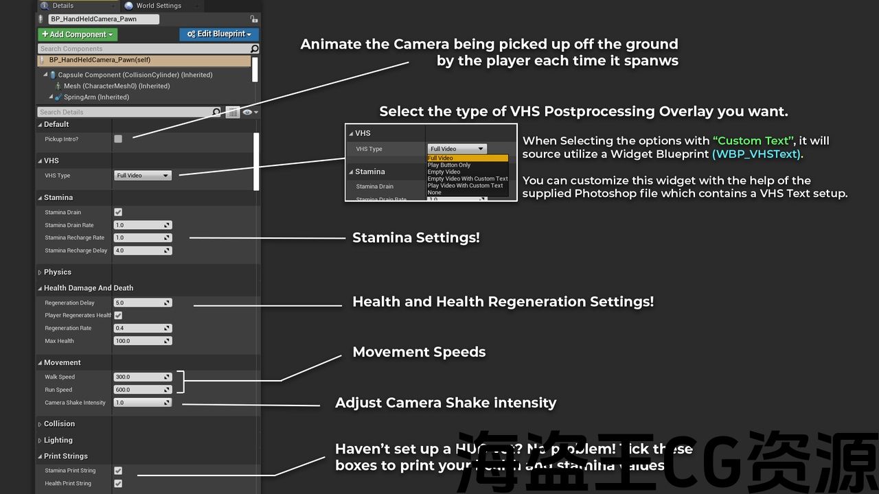 耐力和健康值可以很容易地修改,以及再生延迟和再生率只需打开 BP_HandHeldCamera_Pawn 改变变量