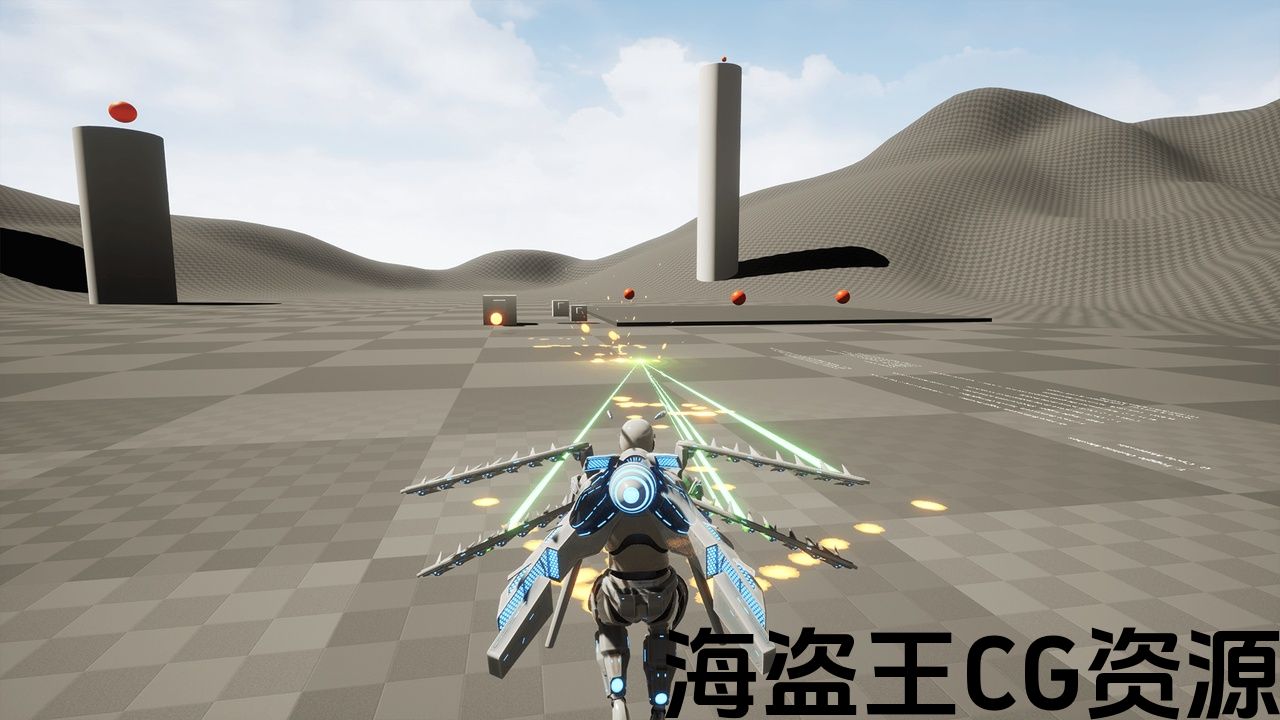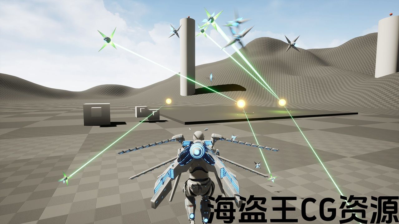蓝图数量:20-21总. 1-2个演示角色(2个用于UE5版本),1个飞行服演员,3个无人机,6个码头,2个横梁和3个盾牌。 还有4个演示目标演员。