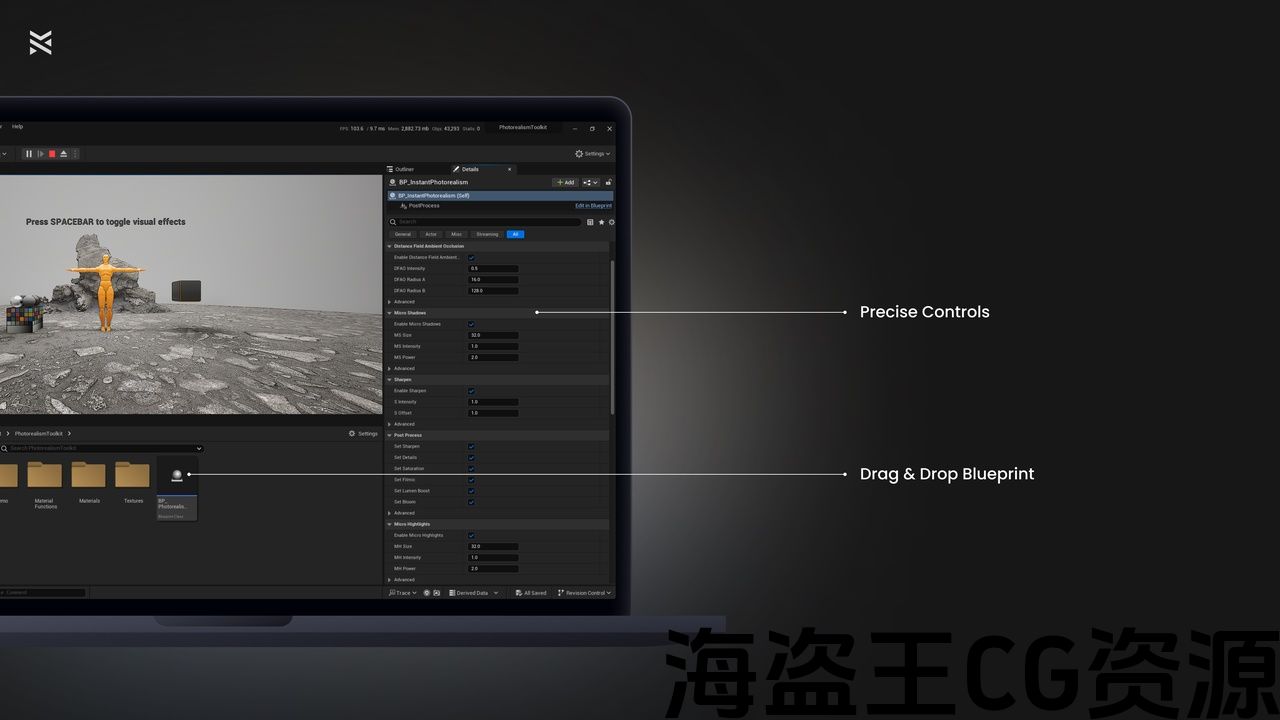 插入 BP_PhotorealismToolkit 进入你的场景。 移除或调整任何冲突的后期处理卷Actor。 选择蓝图并根据需要修改参数以适合您的场景: