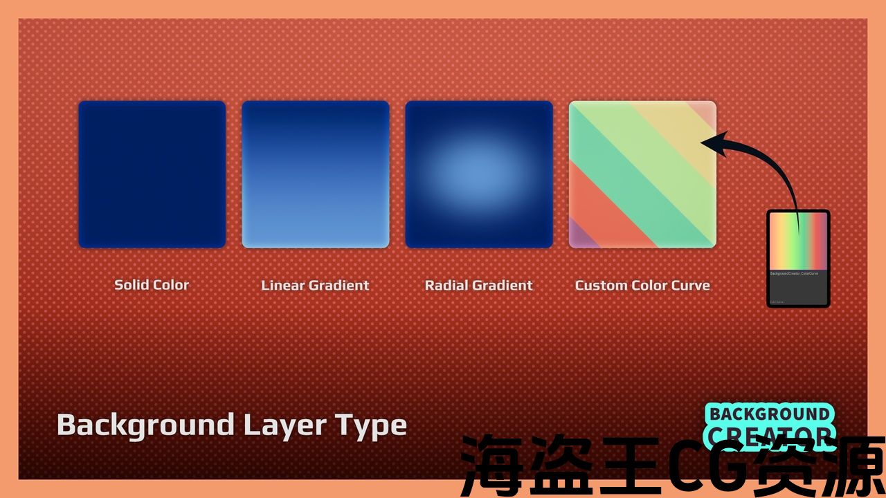Type: Solid, Linear Gradient, Radial Gradient, Custom Color Curve